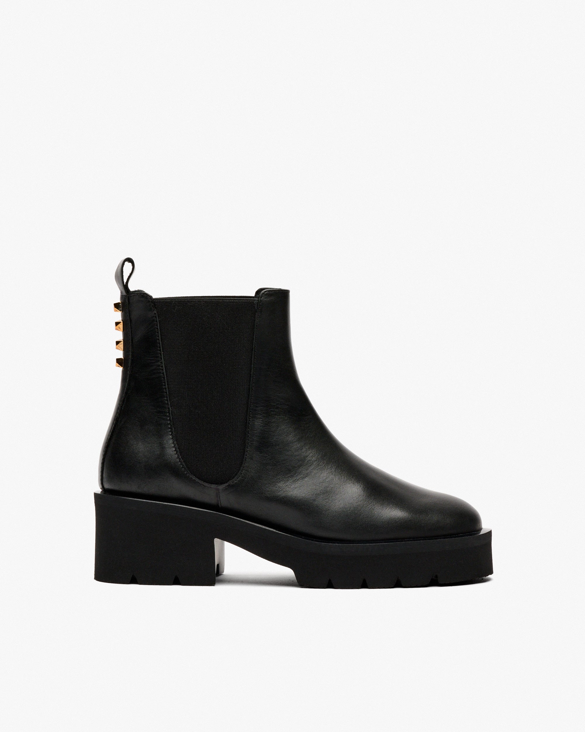 Schwarze Stiefeletten aus Leder mit seitlichem Gummizug. Dieses vielseitige Design zeichnet sich durch Komfort und lässigen Stil aus und ist dank der markanten Sohle mutig. Das Modell zeichnet sich durch seine Leichtigkeit und sein seitliches Gummiband aus, das ein bequemes Anziehen ermöglicht und eine gute Passform am Fuß bietet.