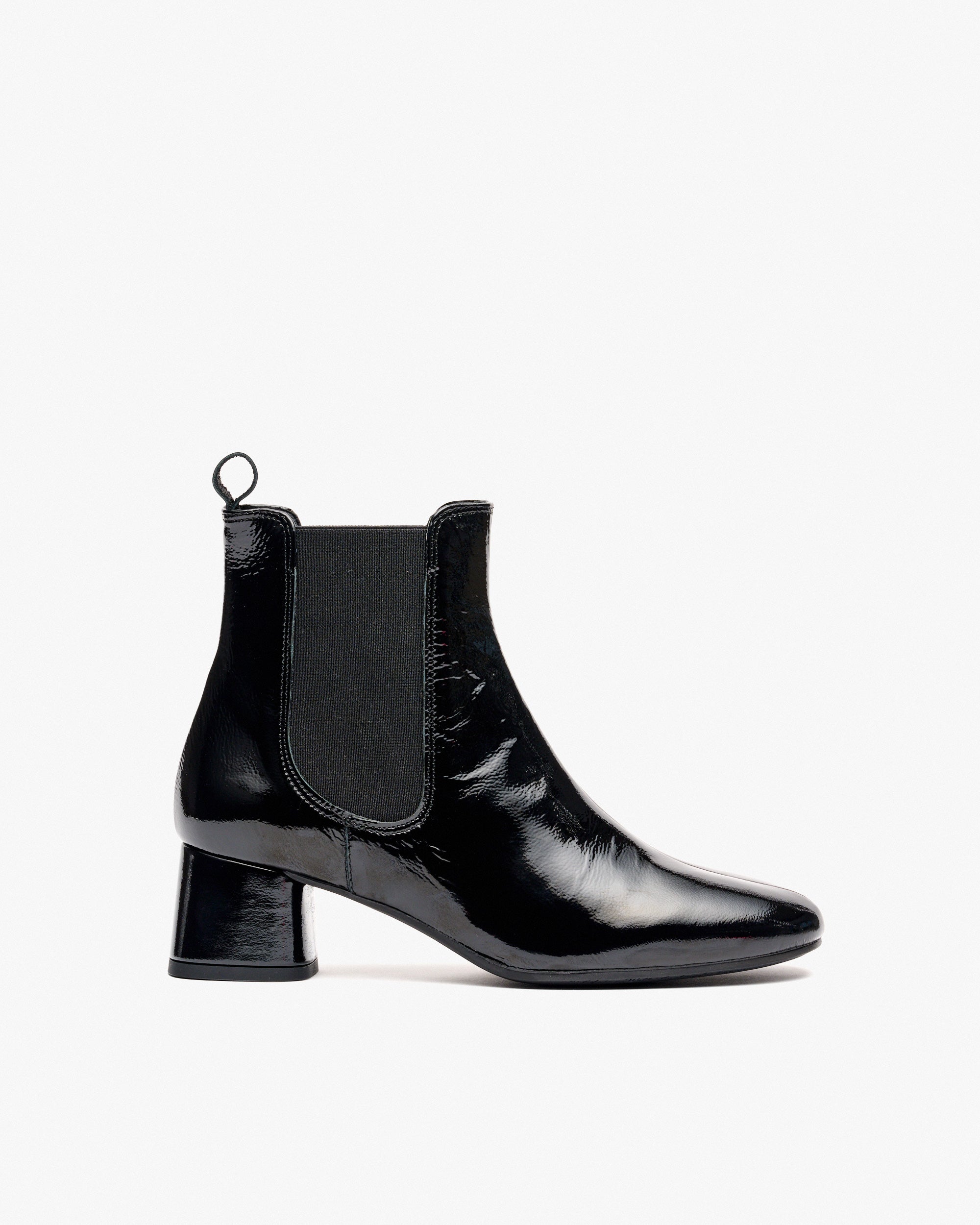 Schwarze Stiefeletten aus Lackleder. Eine ideale Option, um Ihren Winterlooks eine besondere Note zu verleihen. Ihr geradliniger Absatz bietet Ihnen die perfekte Höhe, um einen Look aufzuwerten, und den Komfort, sie den ganzen Tag zu tragen. Es verfügt über ein elastisches Seitenband, um sie bequem anzuziehen und die Bewegung des Knöchels zu erleichtern.