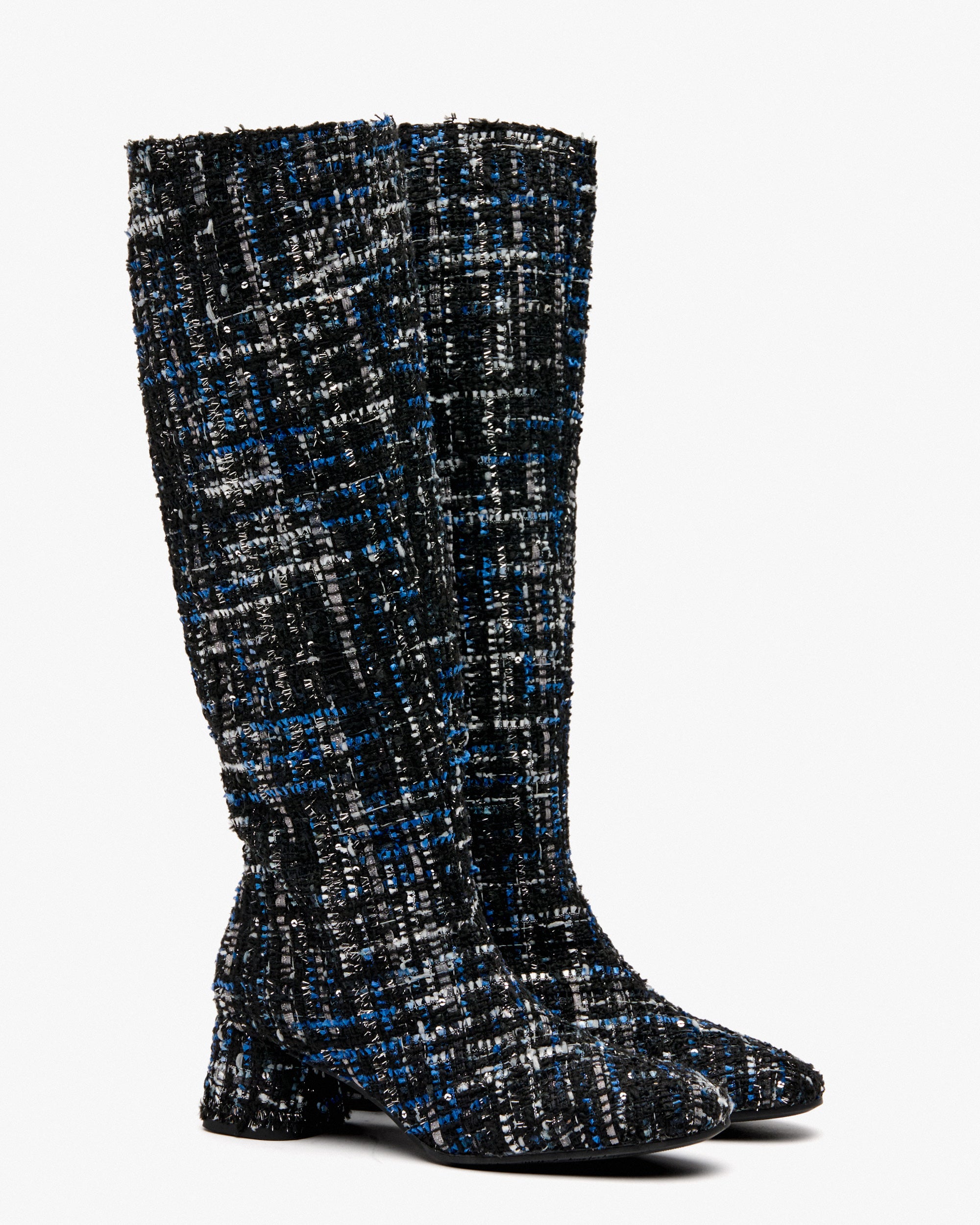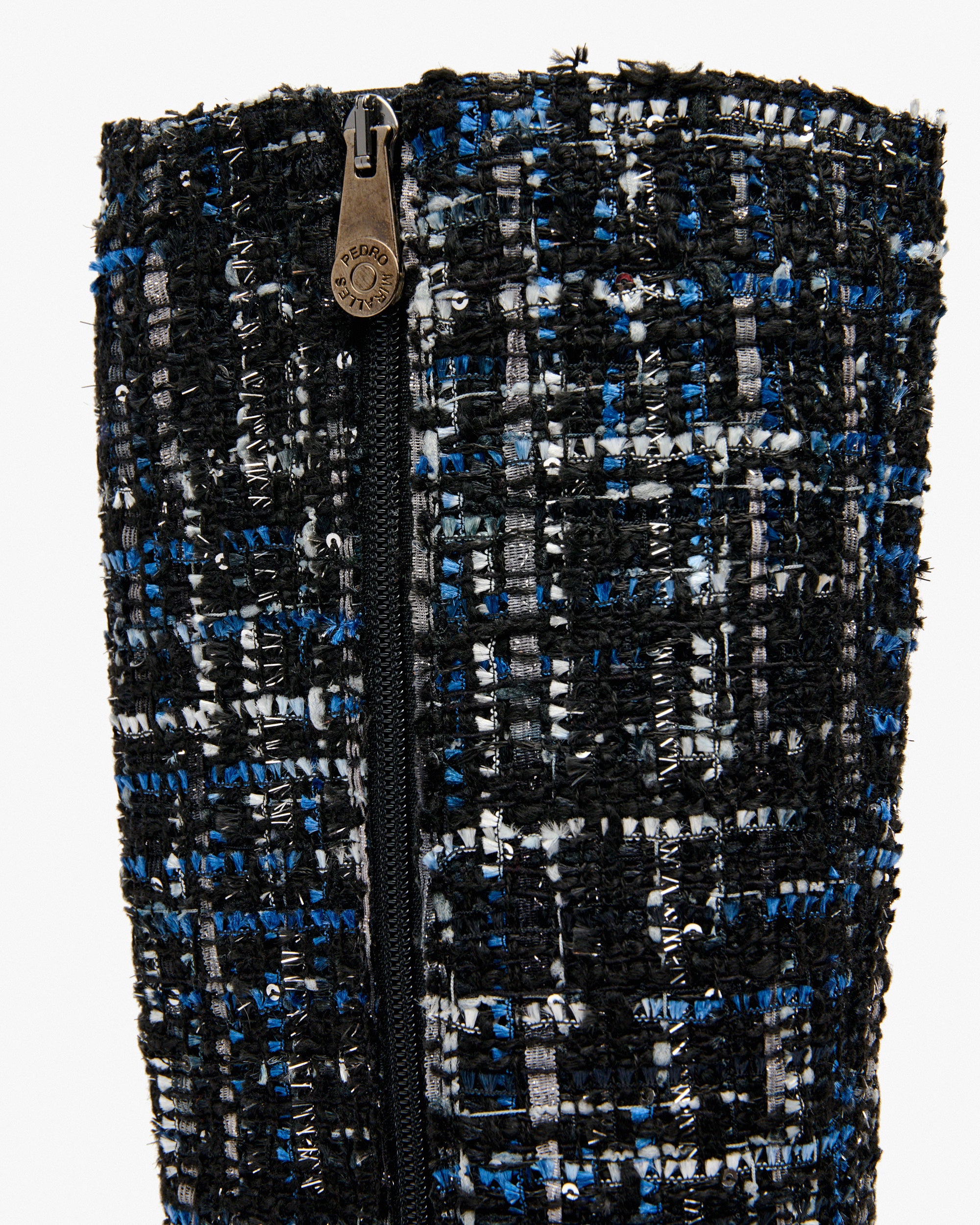 Stiefel mit Absatz aus Stoff in Tweed-Optik in Schwarztönen. Die speziellsten Stiefel der Saison, die in der Lage sind, jeden Look aufzuwerten. Ein schickes und raffiniertes Modell, das sich ideal zu Minikleidern und Röcken kombinieren lässt.
