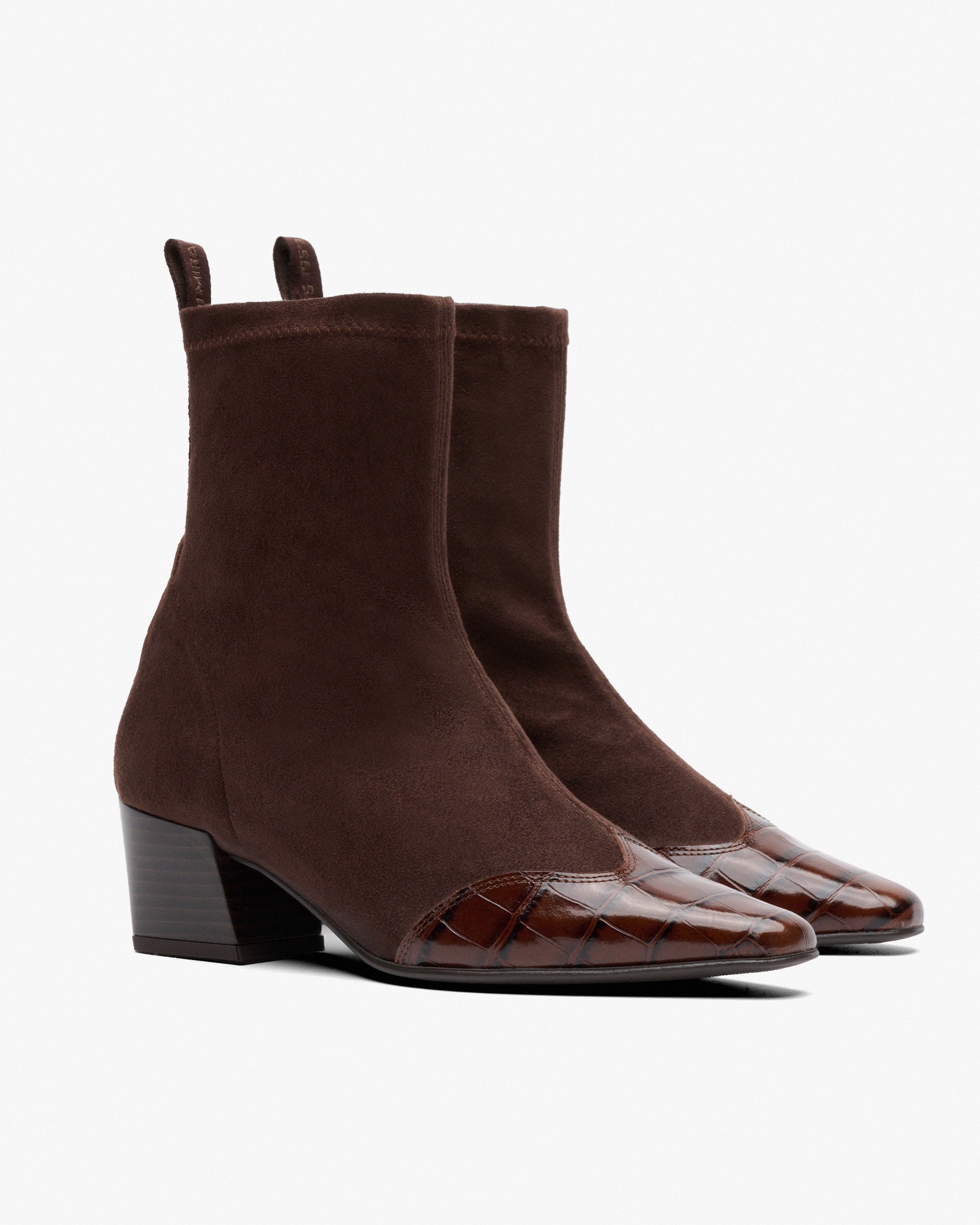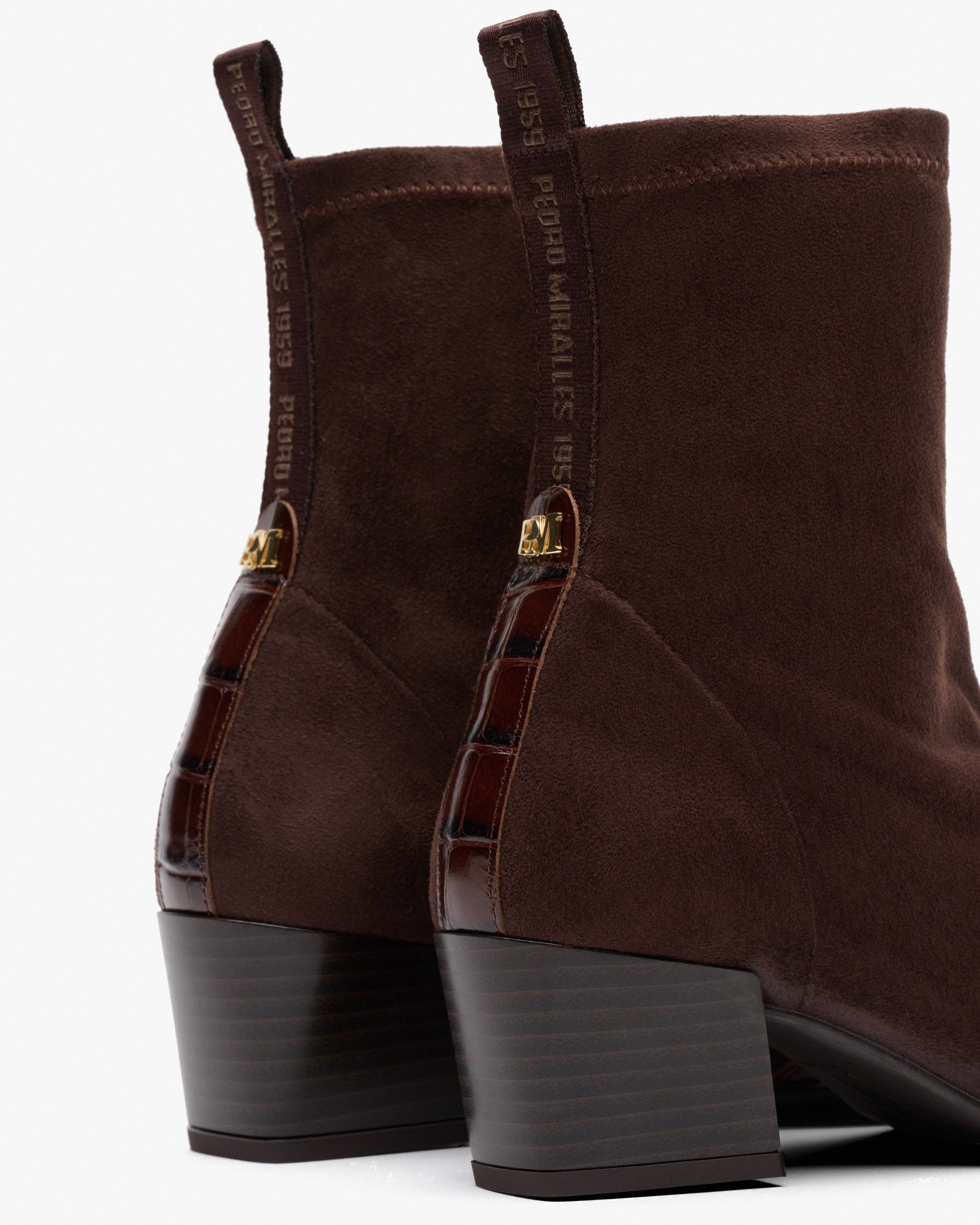 Braune Stiefeletten aus Stretchgewebe in Wildlederoptik mit geprägten Lederdetails. Das Lederdetail auf der Vorder- und Rückseite des Schuhs verleiht dem Modell einen kühnen und modernen Touch. Das Stretchgewebe bietet optimalen Halt und erhöht den Bewegungskomfort beim Gehen.