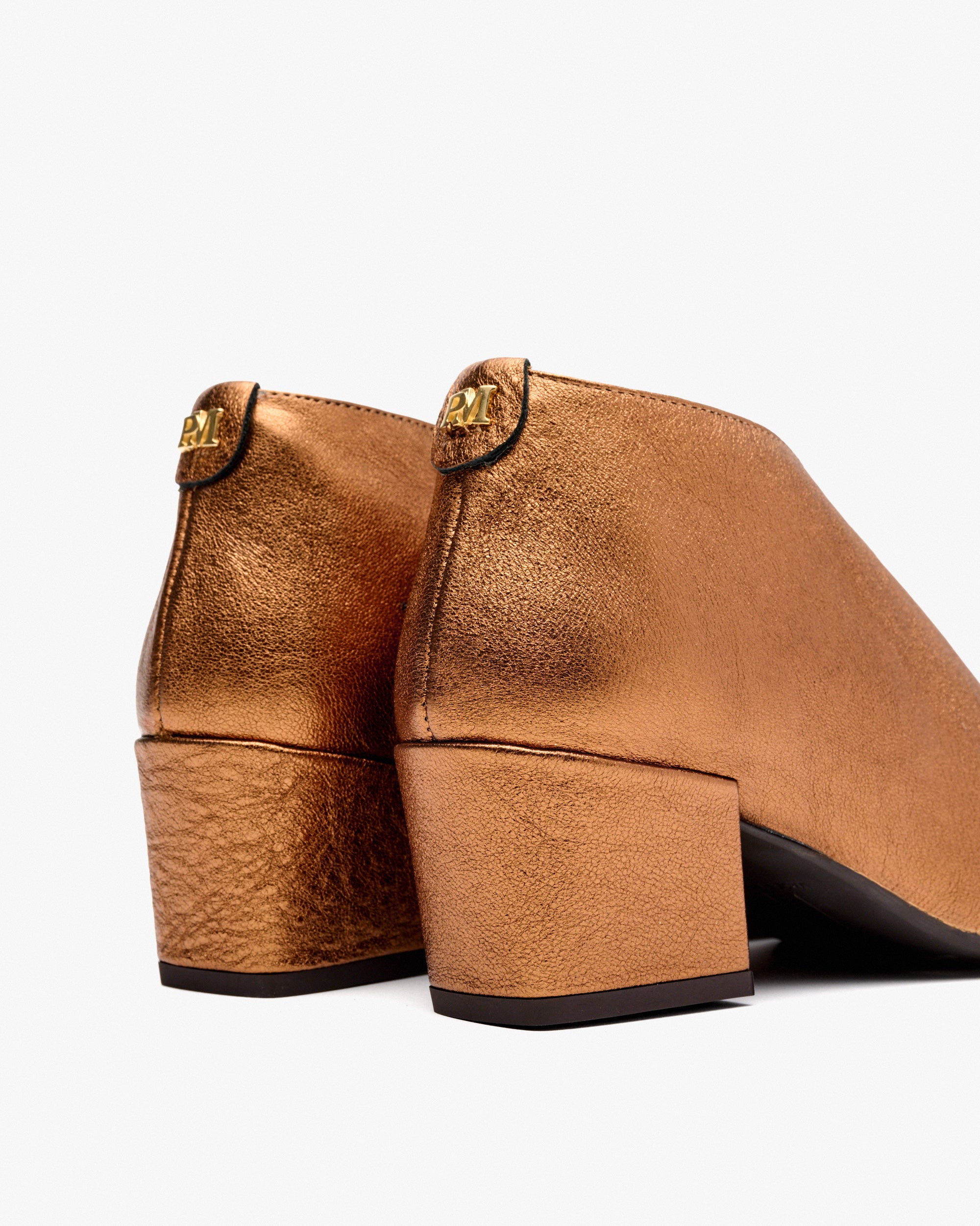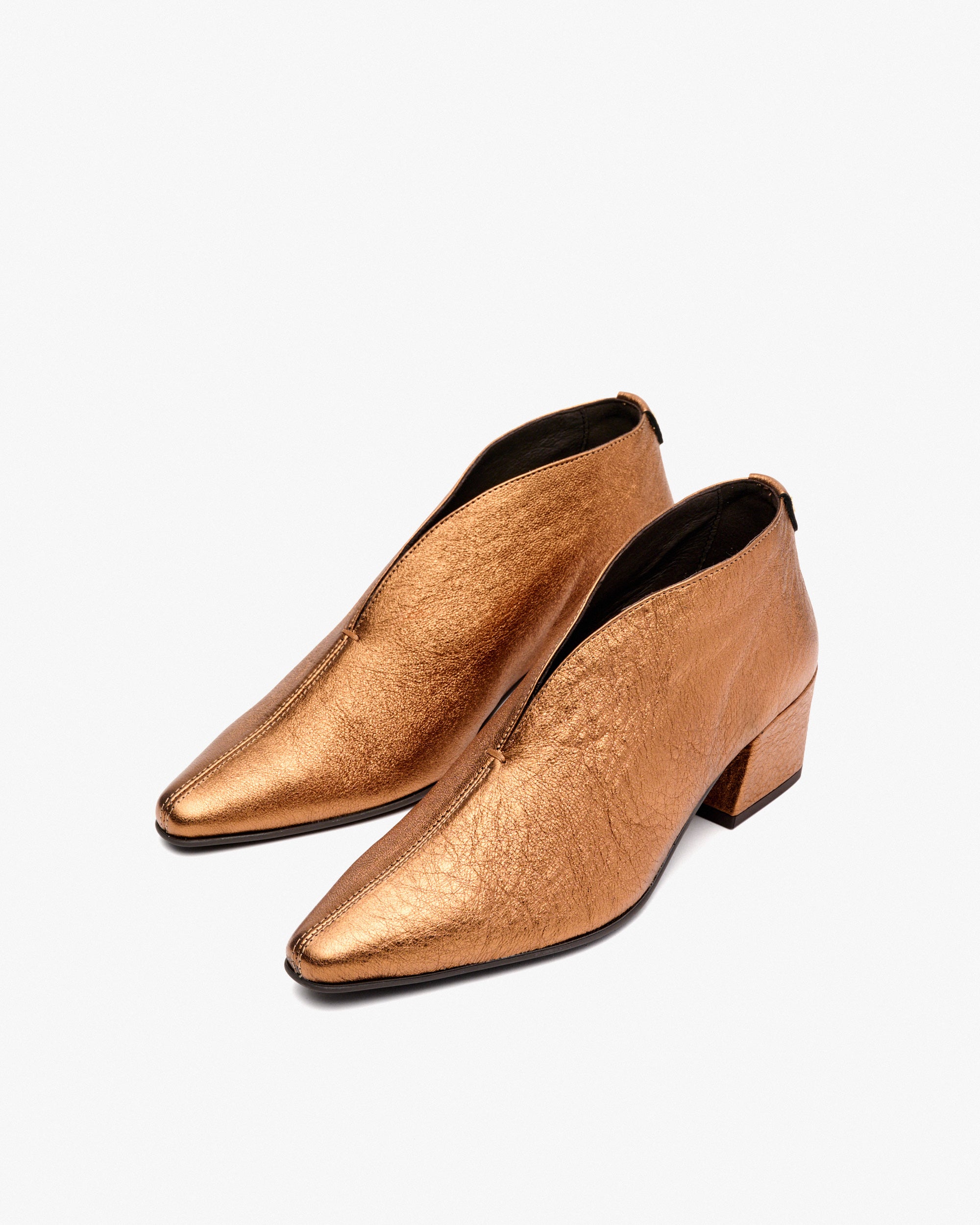 Bronzefarbene Stiefeletten aus Metallic-Leder. Dieses schmeichelhafte Design mit feiner Zehenpartie ist leicht zu tragen und bietet ein klassisches und raffiniertes Design. Seine Silhouette spielt mit der Struktur der Stiefeletten und Absätze, dank des ausgeprägten Ausschnitts des Spanns.