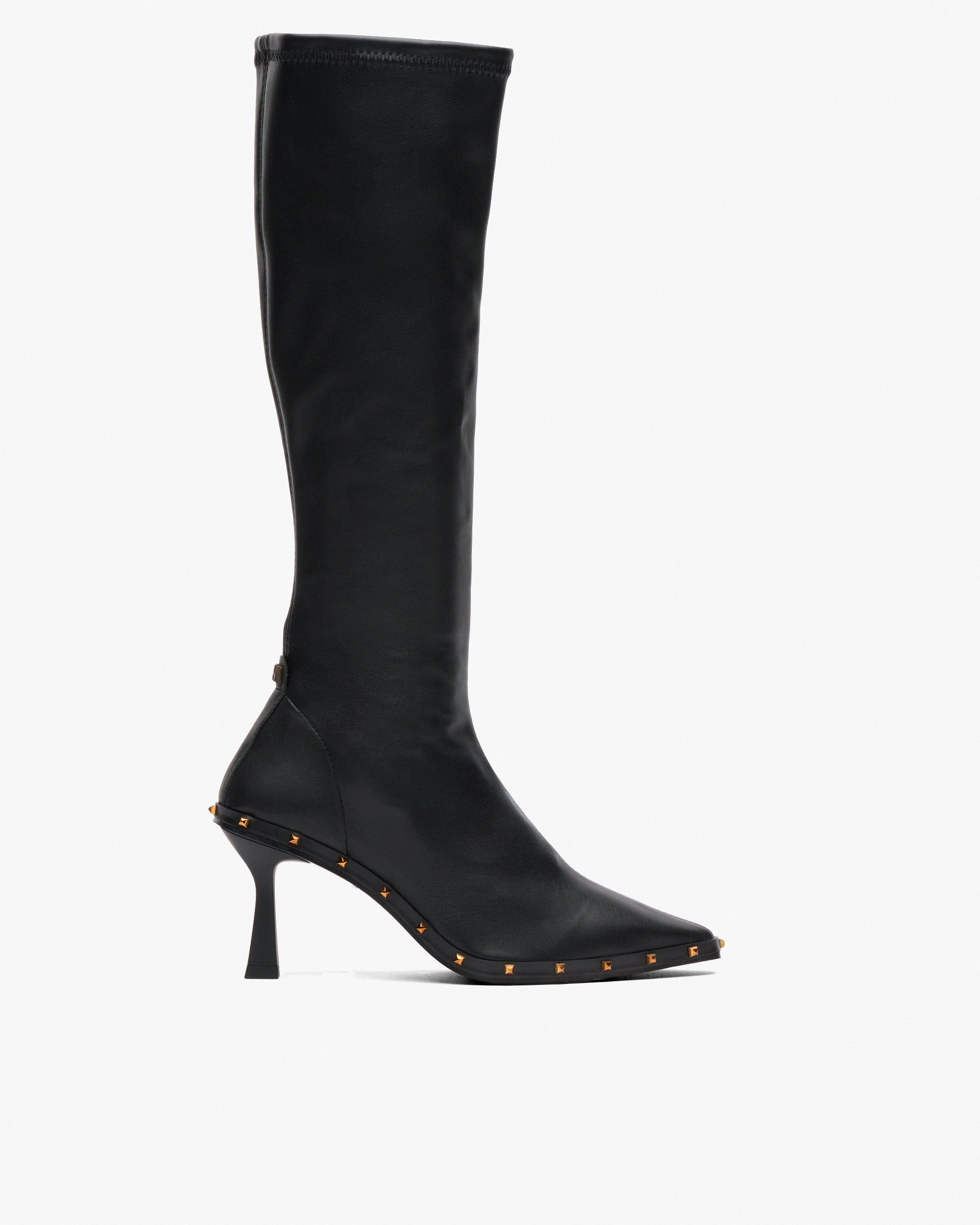 Stiefel aus Stretchgewebe mit schwarzem Ledereffekt. Diese Stiefel sind zweifellos ein Muss in jedem Kleiderschrank, da sich ihre Vielseitigkeit und ihr Material für mehr Komfort an Ihr Bein anpassen.