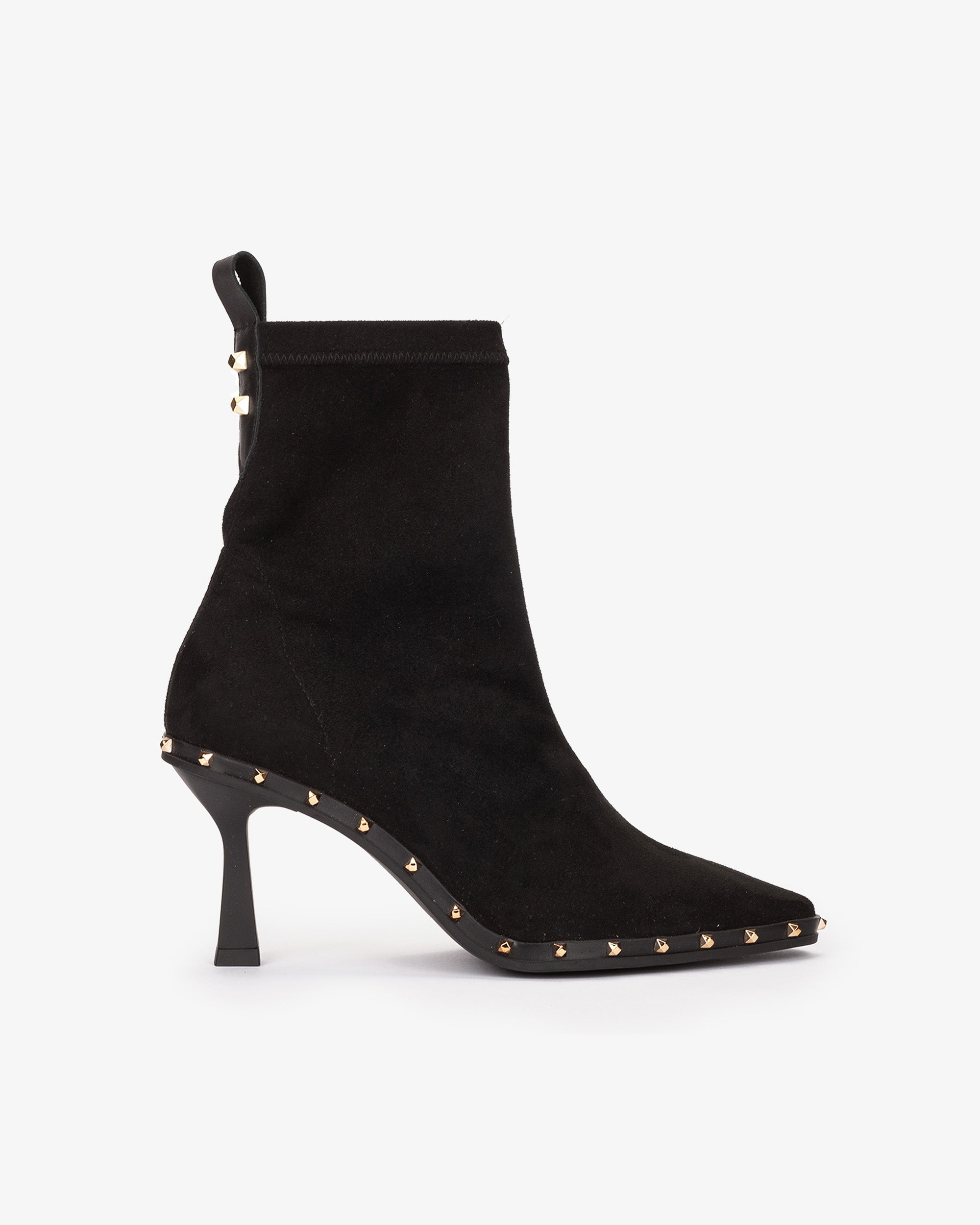 Schwarze Stiefeletten aus Stretchgewebe in Wildlederoptik. TORONTO Stiefeletten sind ein klassisches Must-Have in jedem Kleiderschrank. Ein Design, das Stil und Vielseitigkeit vereint und eine elegante und zeitlose Option für verschiedene Anlässe bietet. Sein Stretchgewebe bietet eine optimale Passform und mehr Bewegungskomfort beim Gehen. Das Detail der Nieten macht den Unterschied des Modells aus.