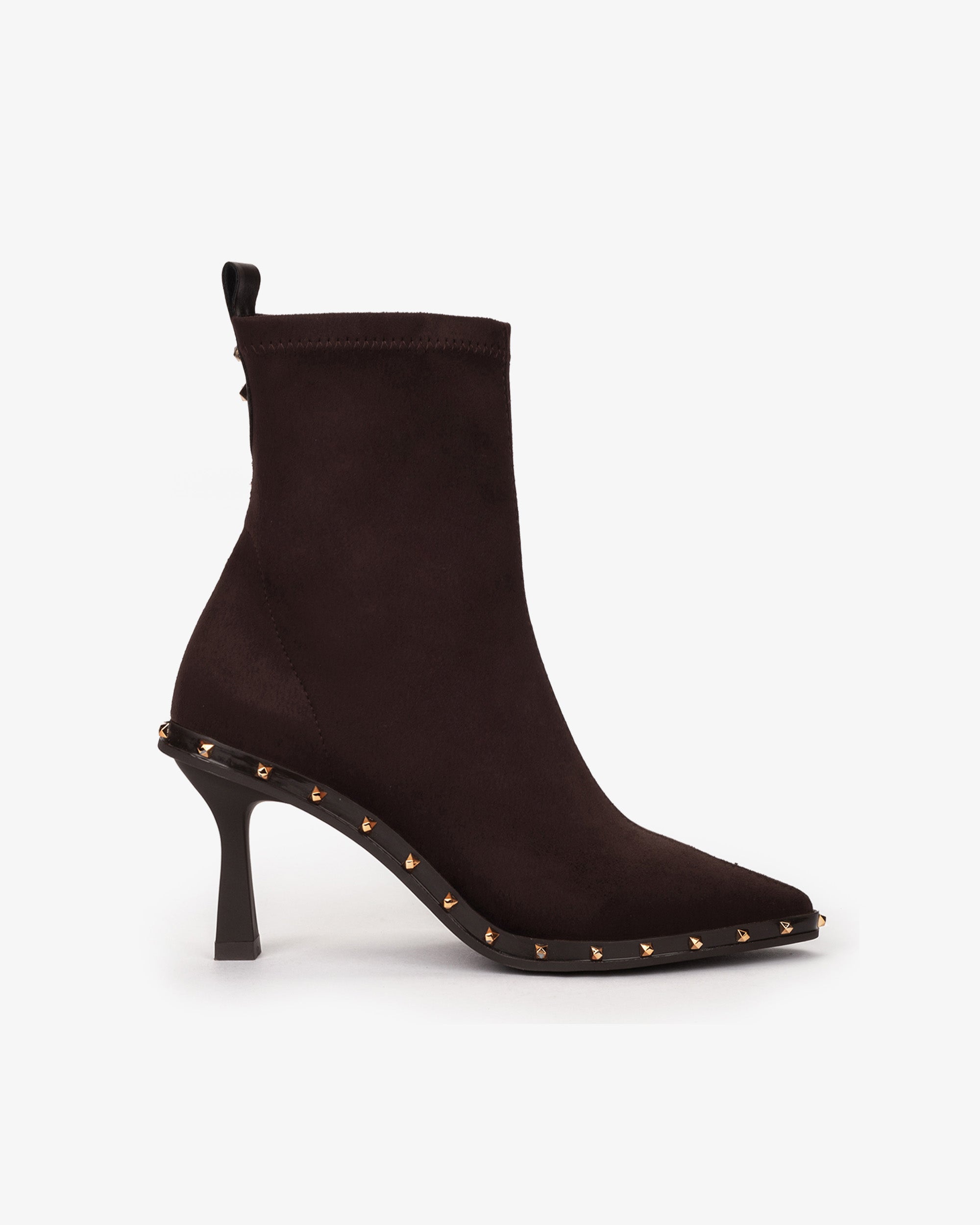 Braune Stiefeletten aus Stretchgewebe mit Wildledereffekt. TORONTO Stiefeletten sind ein klassisches Must-Have in jedem Kleiderschrank. Ein Design, das Stil und Vielseitigkeit vereint und eine elegante und zeitlose Option für verschiedene Anlässe bietet. Sein Stretchgewebe bietet eine optimale Passform und mehr Bewegungskomfort beim Gehen. Das Detail der Nieten macht den Unterschied des Modells aus.