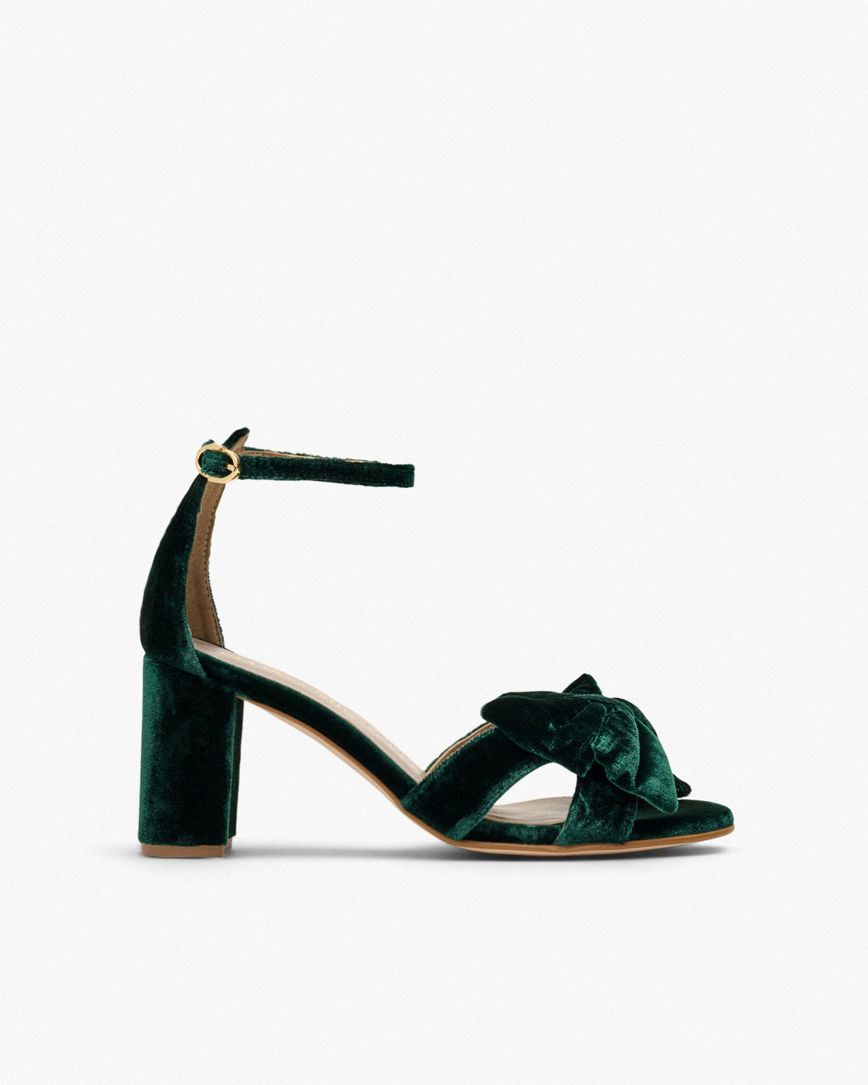 Grüne Sandalen aus Samt. Ein romantisches und elegantes Design, dank des Details der Schleife auf dem Spann. Die Silhouette der Ferse zusammen mit dem Armband sorgt für mehr Halt. Eine perfekte Wahl für saisonale Veranstaltungen.