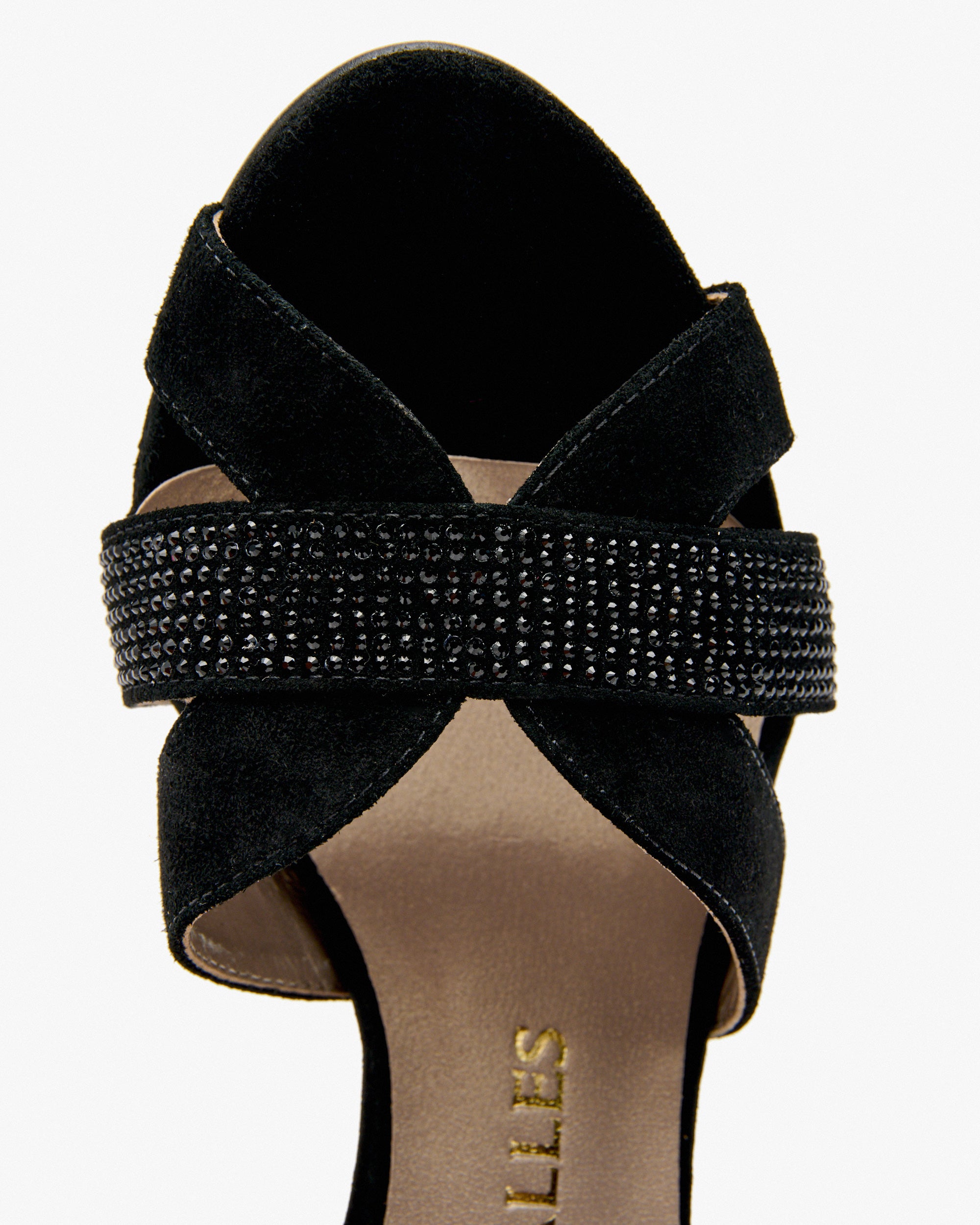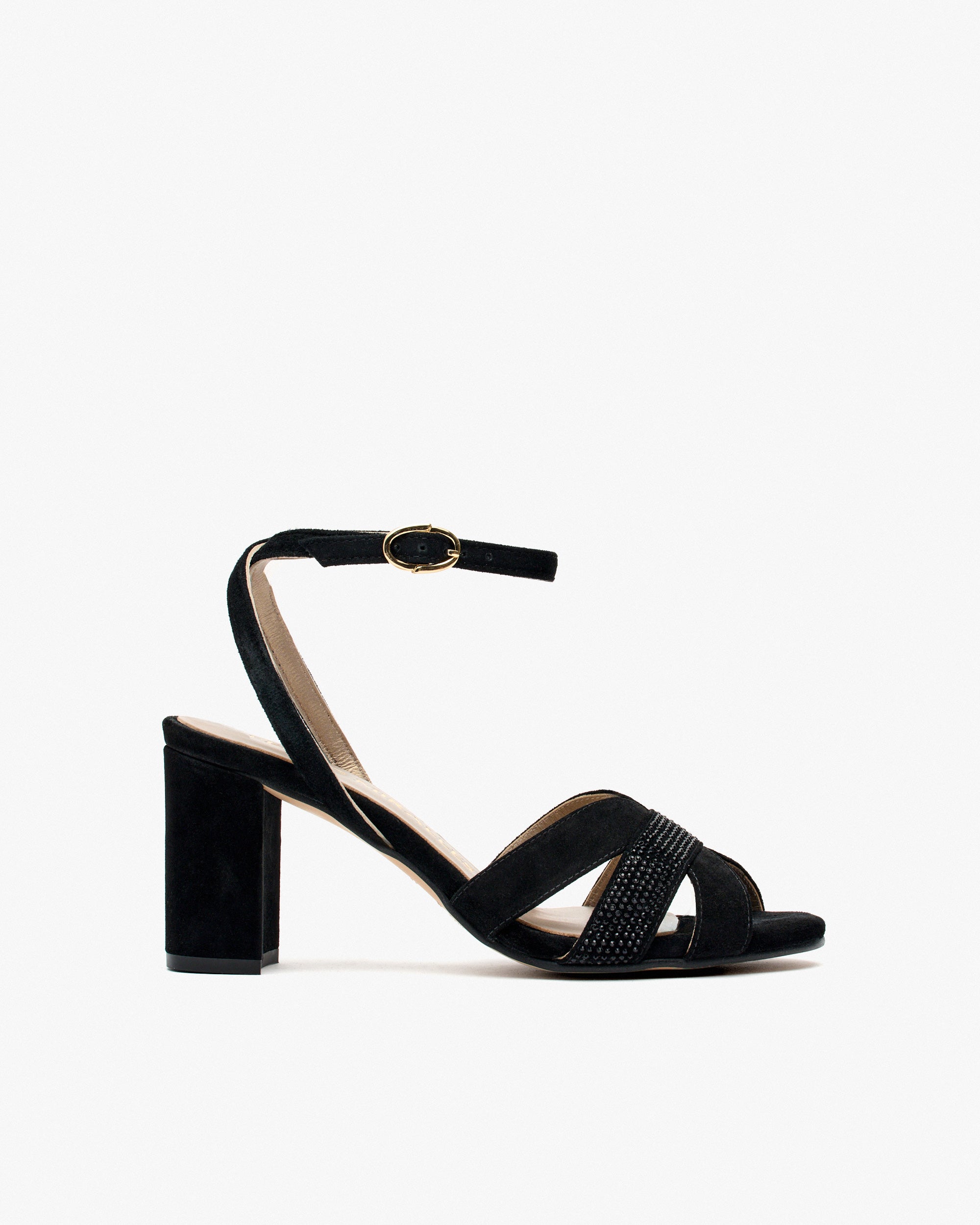 Schwarze Sandalen aus Wildleder mit Glitzer. Sein elegantes Design betont die Silhouette und sorgt dank der Klinge für guten Halt. Die Kombination aus Wildleder mit den Details des Glitzers hebt die Raffinesse des Modells hervor. Es hat einen gekreuzten Knöchelriemen, um die Passform und Bewegung des Fußes zu fördern.