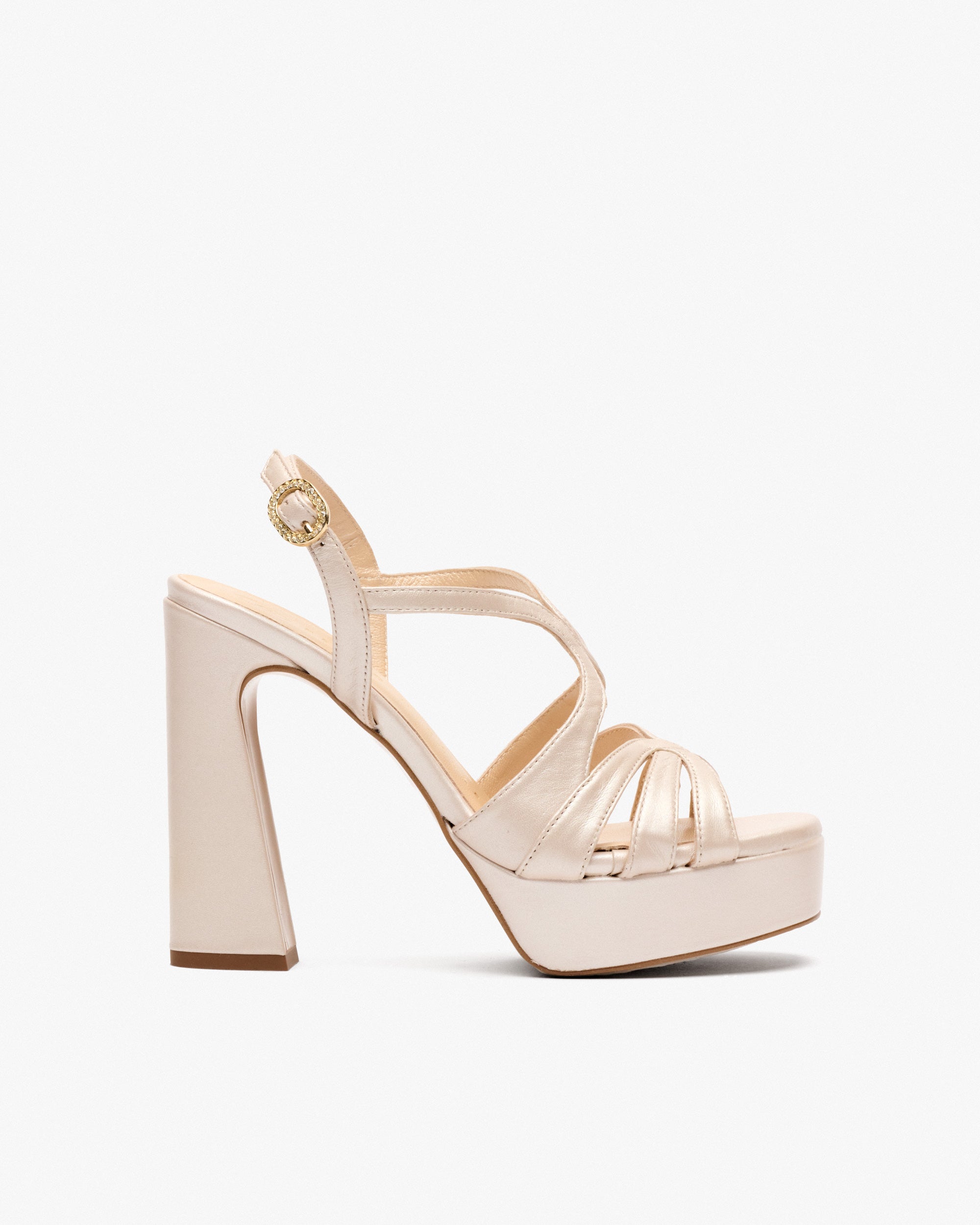 Sandalen aus Leder mit Absatz in vanillefarbener Farbe. Hergestellt mit geschwungenen Trägern am Spann, um einen eleganten und einzigartigen Ausschnitt zu schaffen. Ohne Zweifel ein Modell, das dank seines besonderen Designs stilisiert.