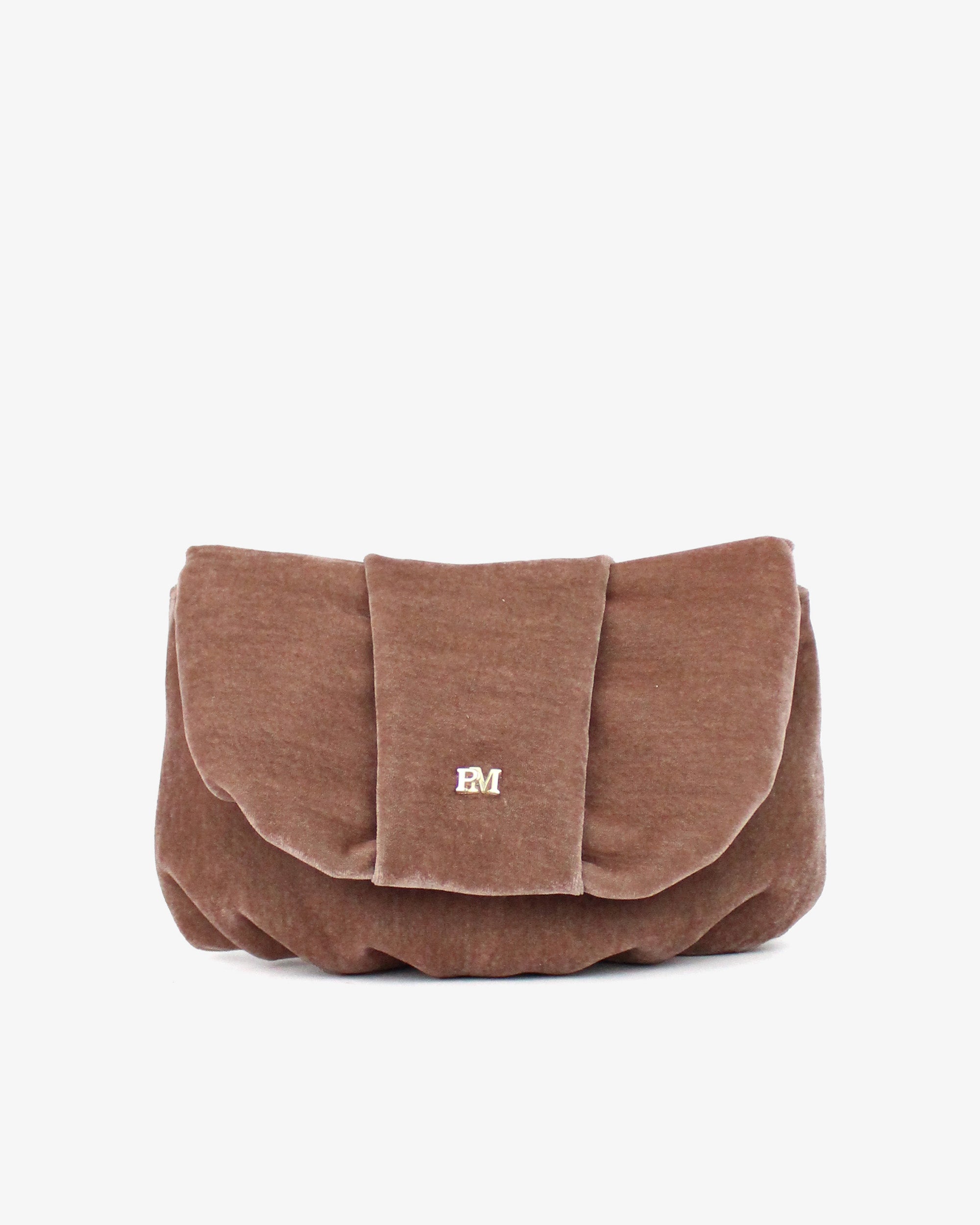 Handtasche aus nudefarbenem Samt. Dieses Modell zeichnet sich durch seine geraffte Silhouette aus, die einen Steppeffekt erzeugt. Samt hebt die Raffinesse des Modells hervor und macht es perfekt für saisonale Veranstaltungen. Es hat eine goldene Kette, um es quer über dem Körper oder hängend zu tragen. Es hat einen Magnetverschluss.