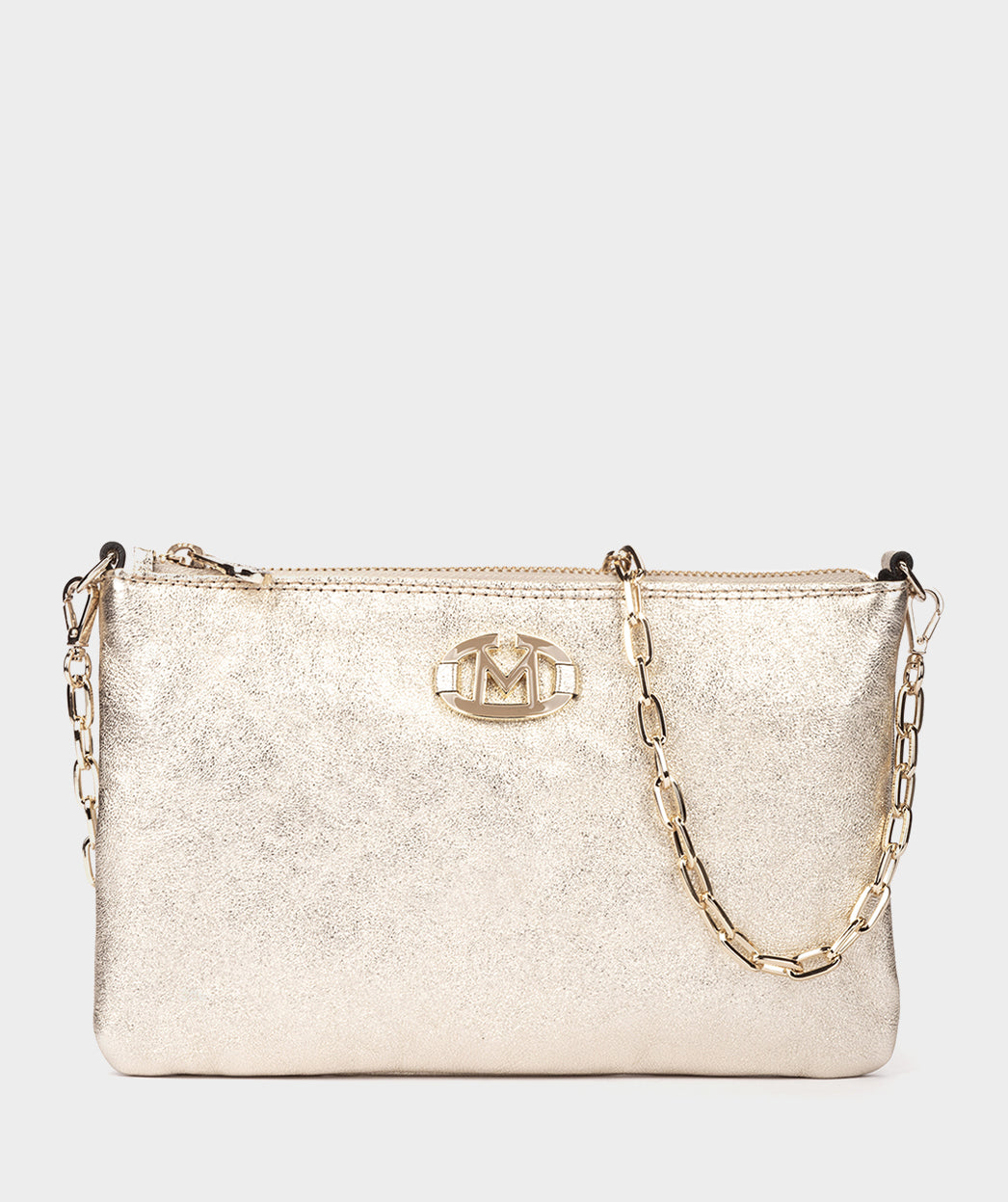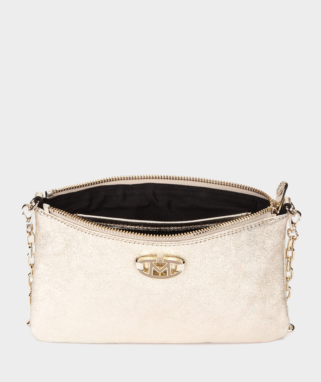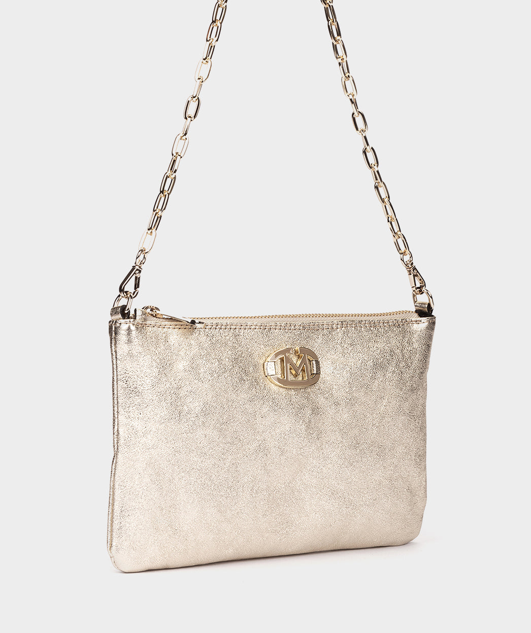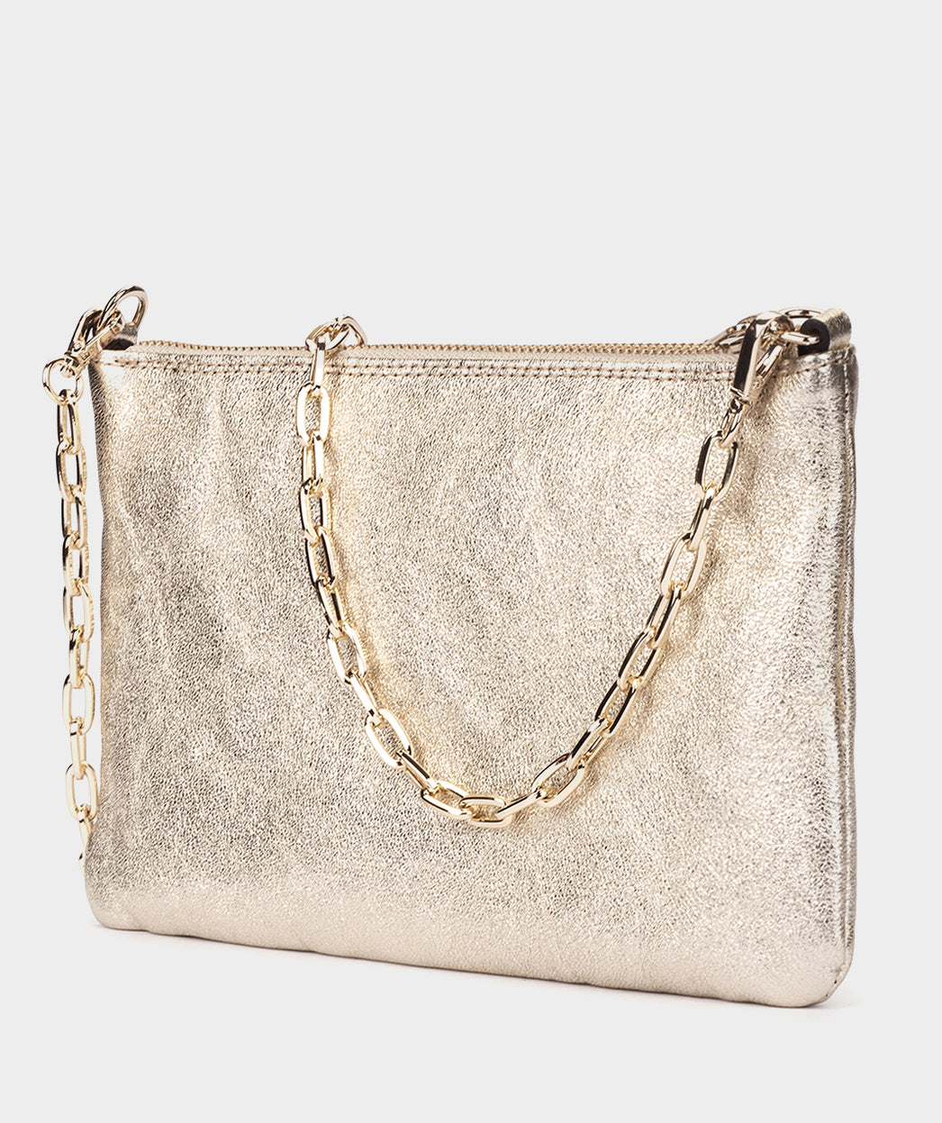 Platinfarbene Abendtasche aus Metallic-Leder mit Kette. Ein zeitloses Design, perfekt für jede Veranstaltung. Das Detail der zur Kette passenden Schnalle verleiht dem Modell Persönlichkeit.