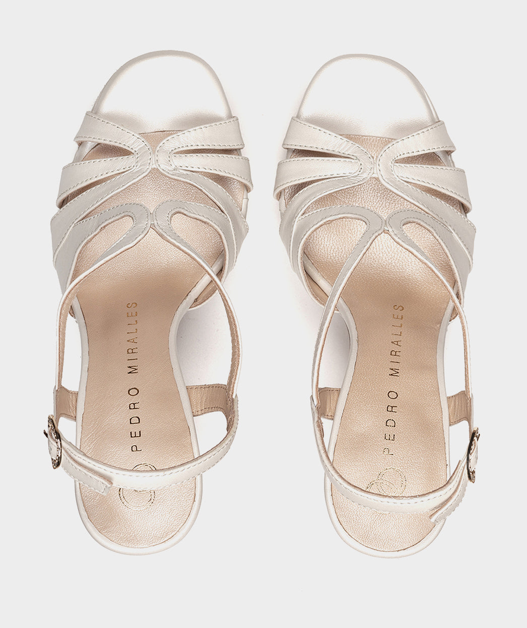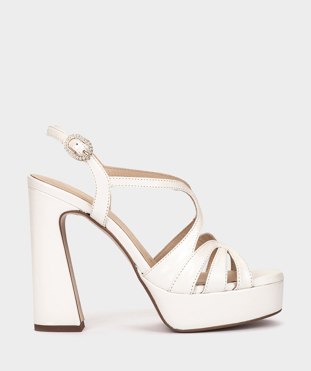 Weiße Ledersandalen mit Absatz. Hergestellt mit geschwungenen Trägern über dem Spann, um einen eleganten und einzigartigen Ausschnitt zu schaffen. Ohne Zweifel ein Modell, das dank seines besonderen Designs stilvoll ist.