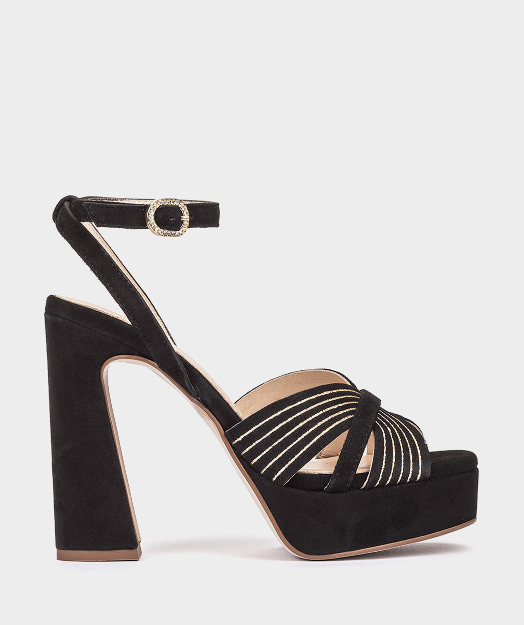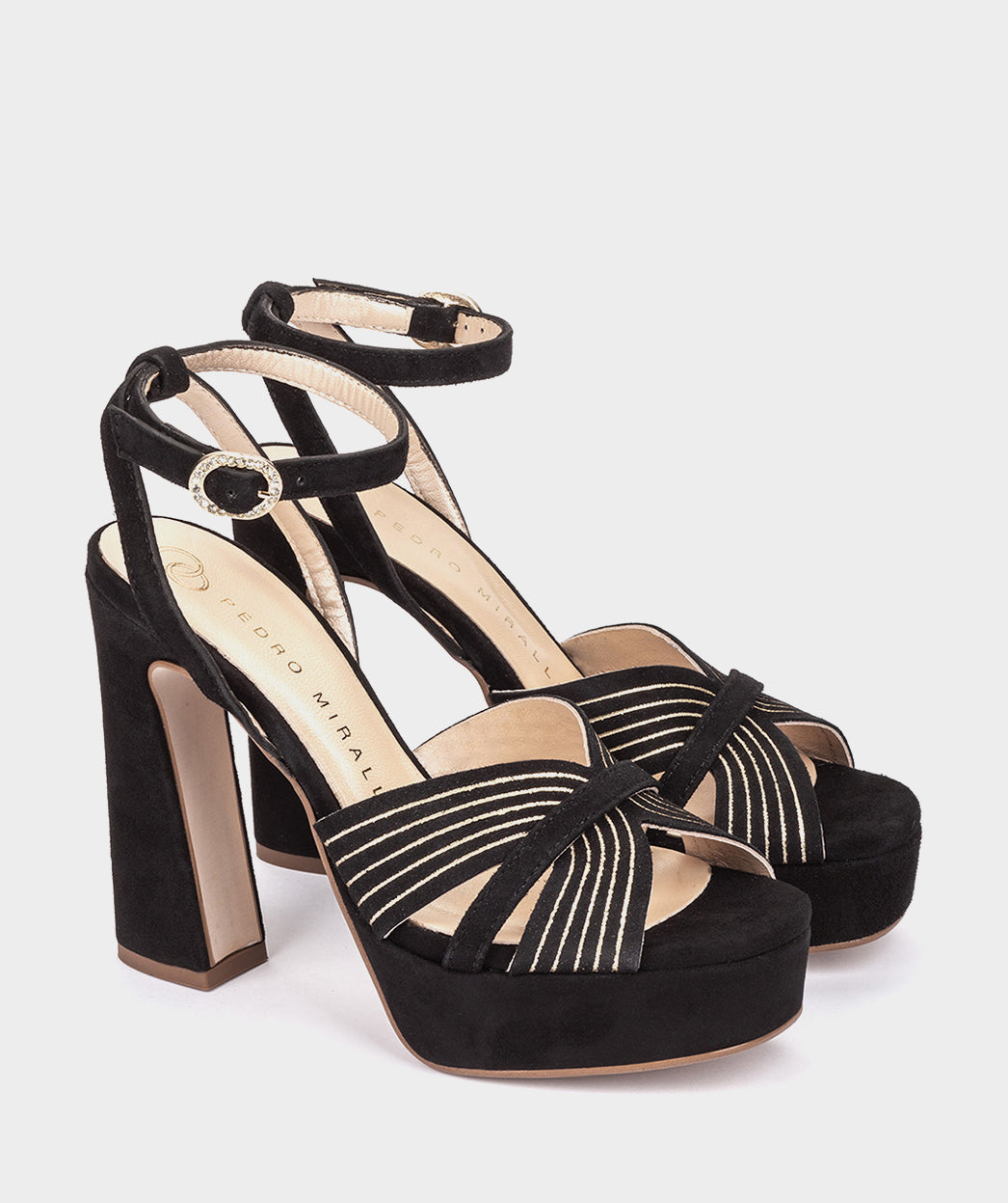 Schwarze Wildleder-Sandalen mit Absatz. Glamouröses Design aus zusammengefügten Trägern, die einen gerippten Effekt erzielen. Die Montefioralle-Sandalen sind die perfekte Ergänzung zu Ihrem festlichen Look.