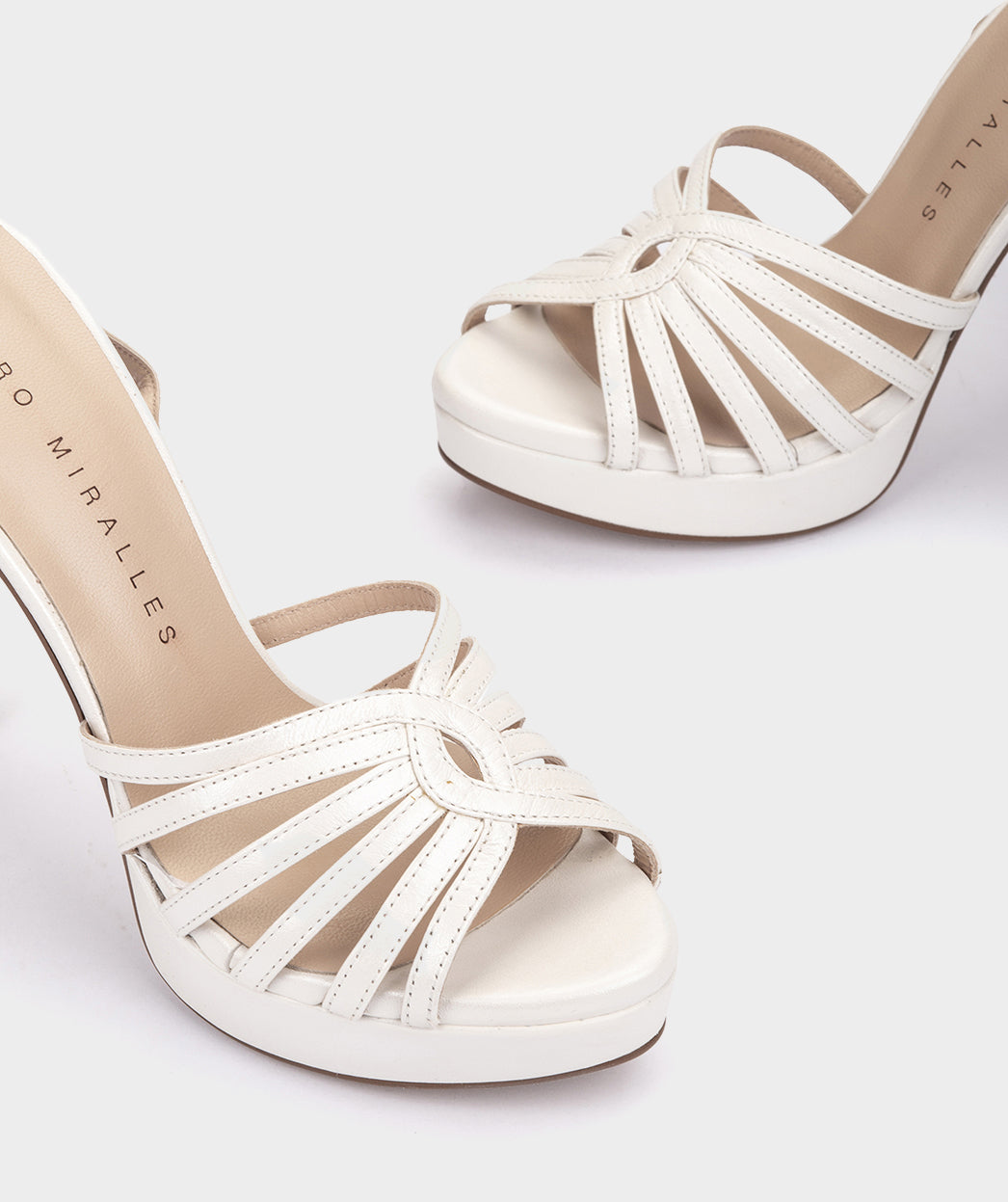 Sandaletten mit perlweißem Lederplateau. Das Etiopia-Modell schafft es dank der Vorbereitung des Riemchenobermaterials, die Silhouette des Fußes zu betonen. Knöchelriemenverschluss. Ein originelles und elegantes Modell für Ihre ganz besonderen Anlässe.