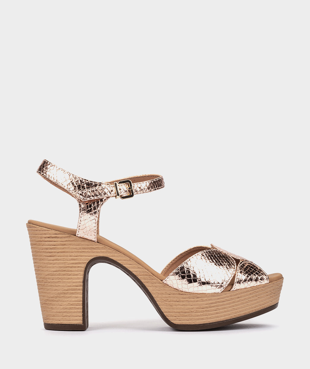 Rose gold metallic leather heeled sandals. This design features a shovel with geometric figures. Closure with ankle bracelet and buckle. Caprera sandals are made with soft, padded insoles ideal for a comfortable fit.