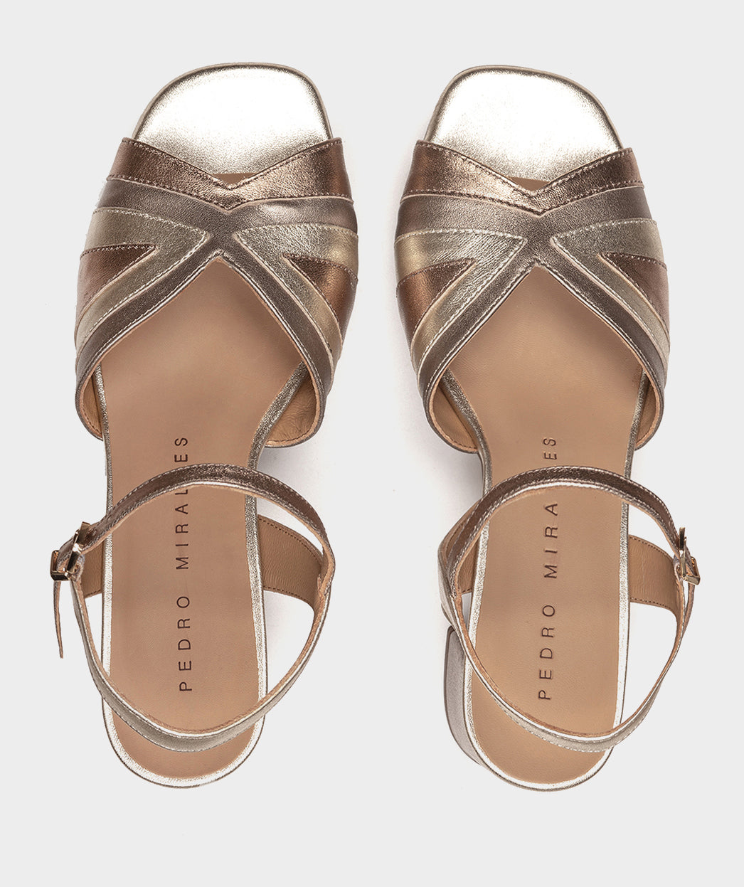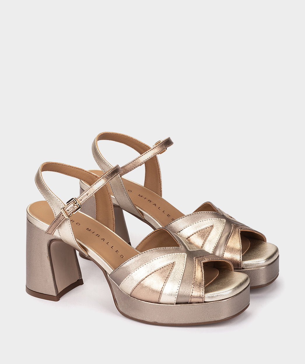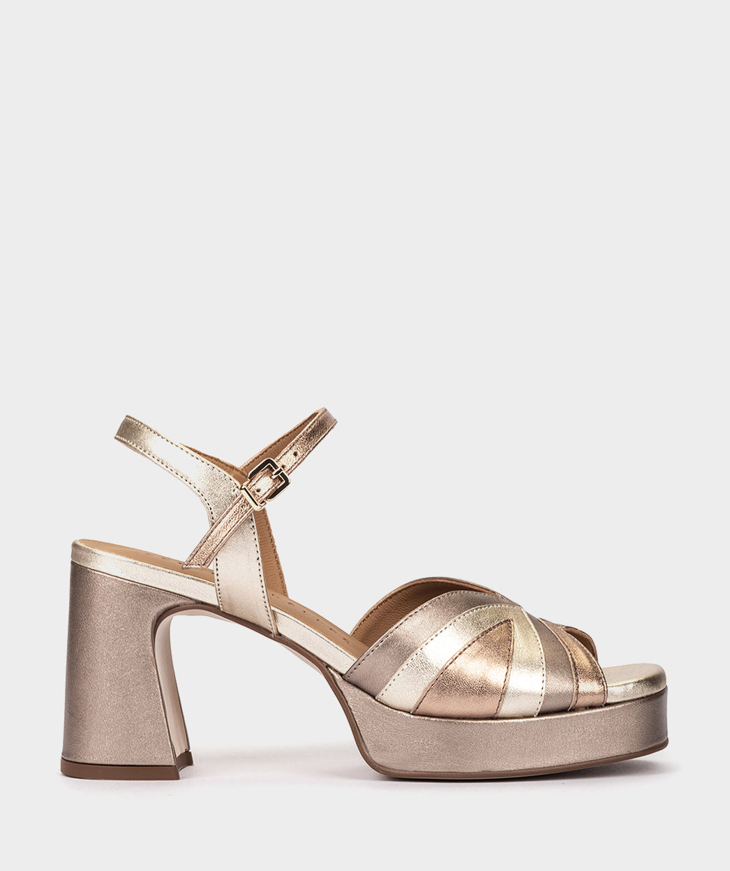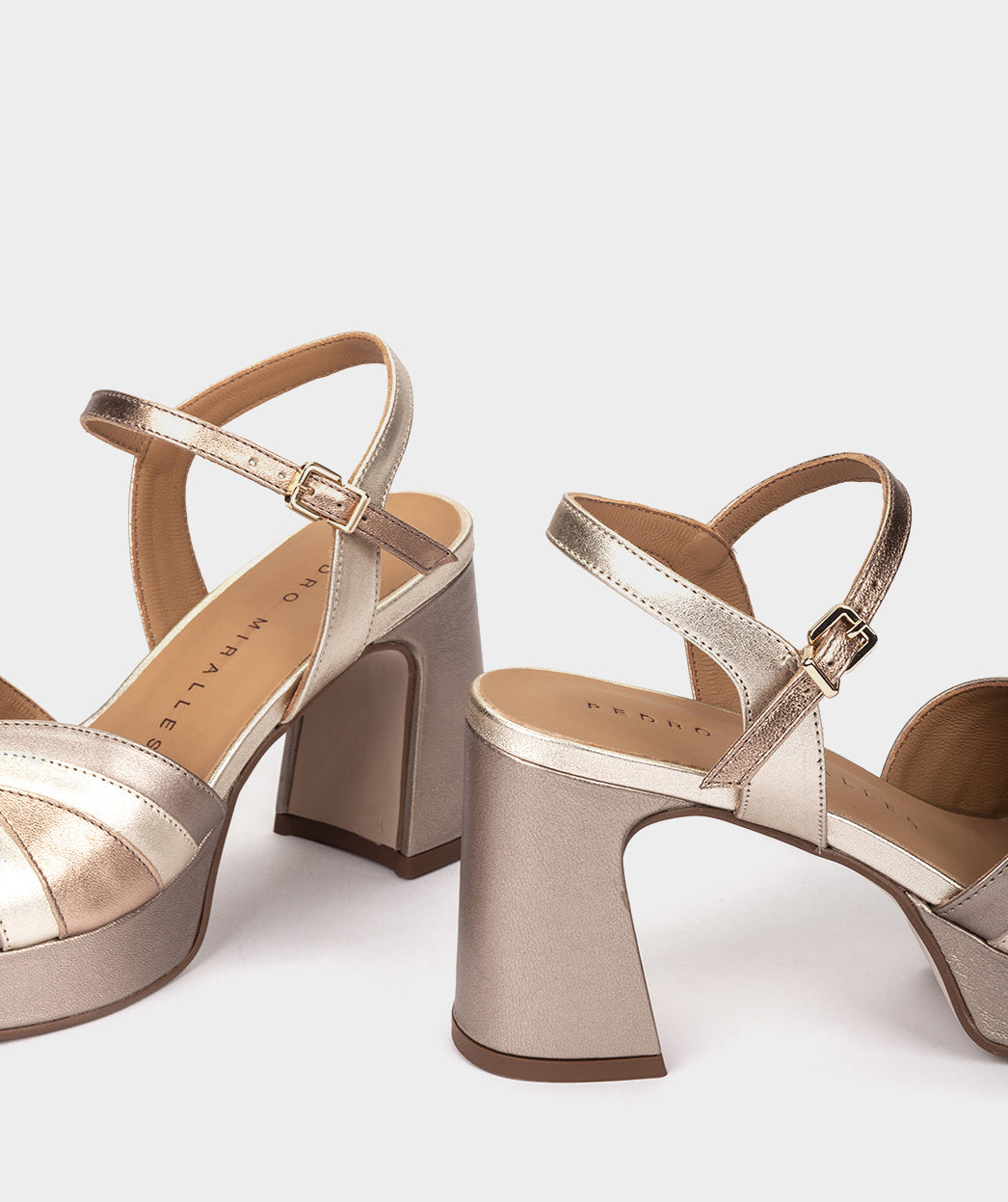 Heeled sandals with platform. Crafted in metallic leather, where three carefully selected colours come together gracefully. Aveiro sandals are an expression of individuality, where art and fashion meet to create a visually stunning and refined experience.