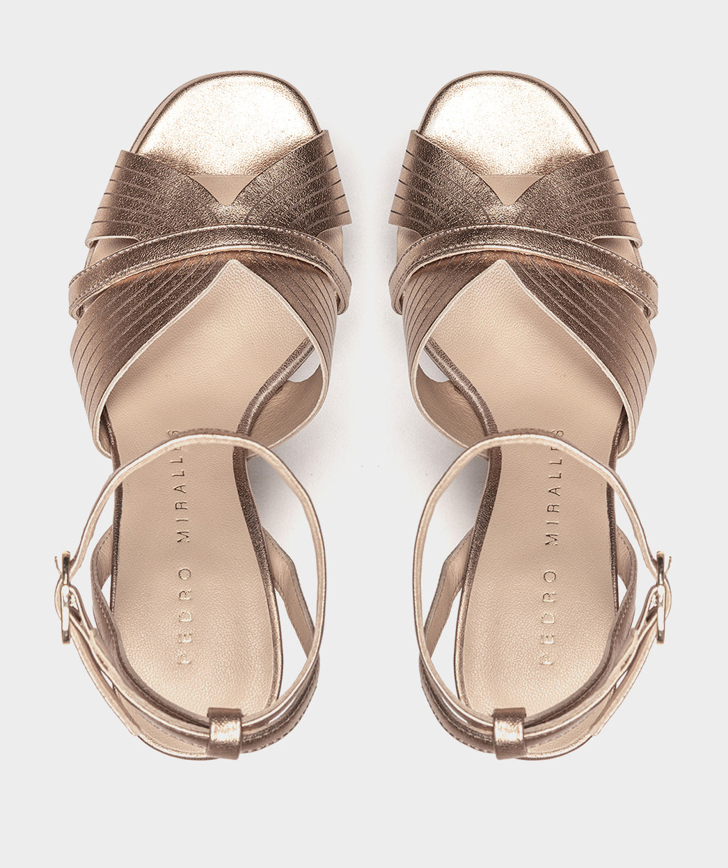 Rose gold metallic leather heeled sandals. Glamorous design of strips joined together to achieve a ribbed effect. The Montefioralle sandals will be the perfect complement to your festive looks.