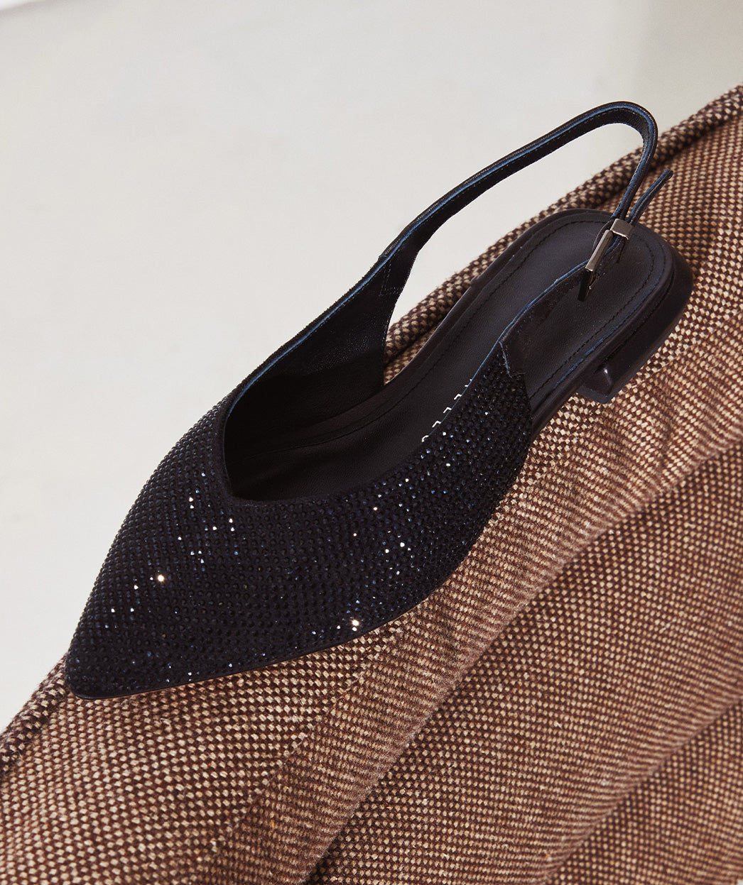 Black leather slingback ballet flats. This design covered in small shiny stones is a perfect fusion between sophistication and luxury, creating footwear that steals glances with every step.