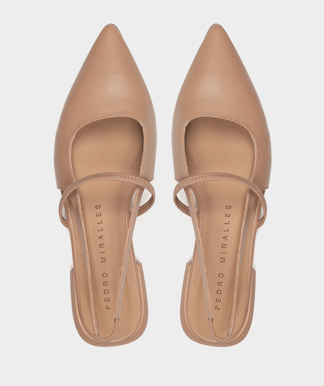 Camel-coloured leather open-toe ballerinas. This shoe is an example of refined simplicity, designed for those seeking the perfect combination of discreet style and comfort.