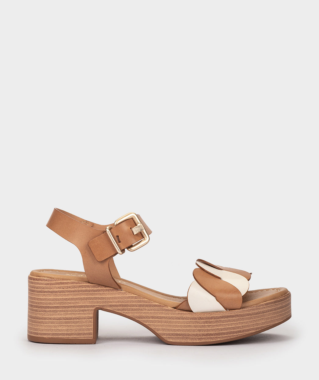 Two-tone leather heeled sandals. A design that stands out for its Mediterranean character, thanks to the combination of the wood-effect platform with the two-tone spiral blade.