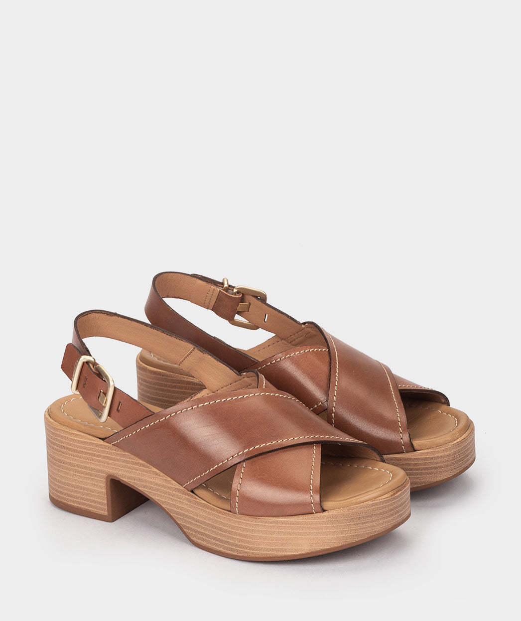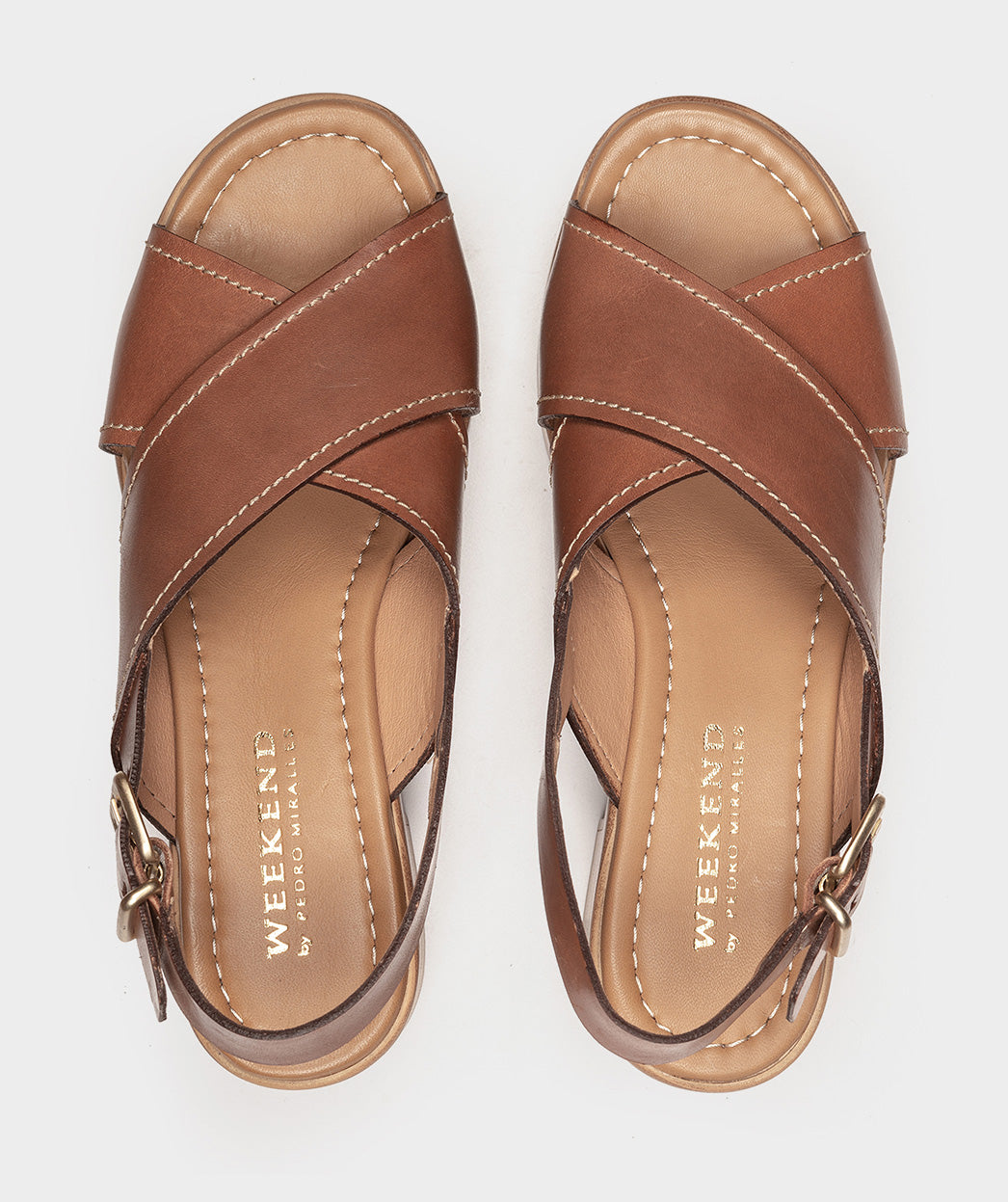 Brown leather sandals with a wood-effect heel. The style's lightness, in addition to its versatile design, is the key to its success. The crossover upper offers greater support.