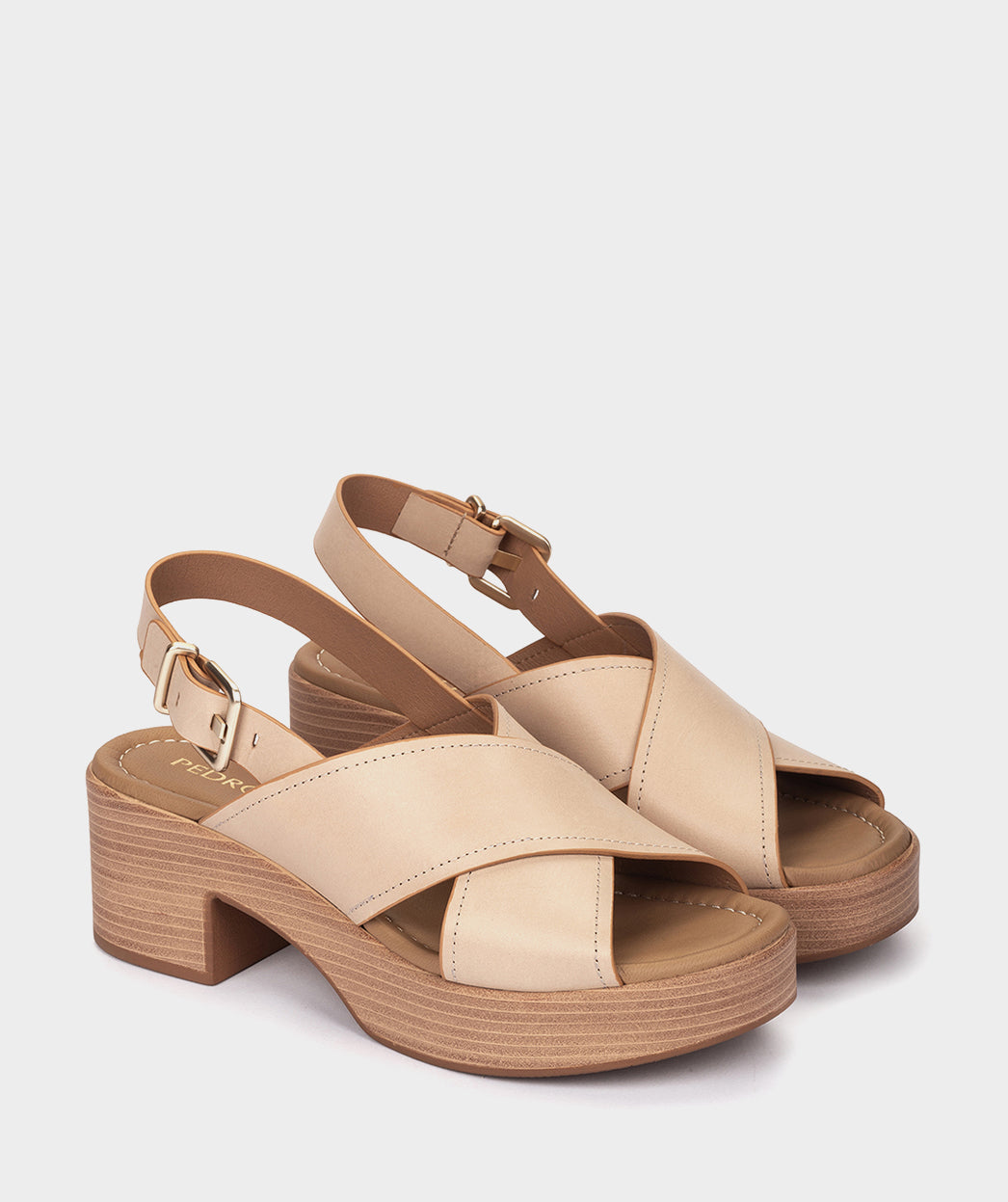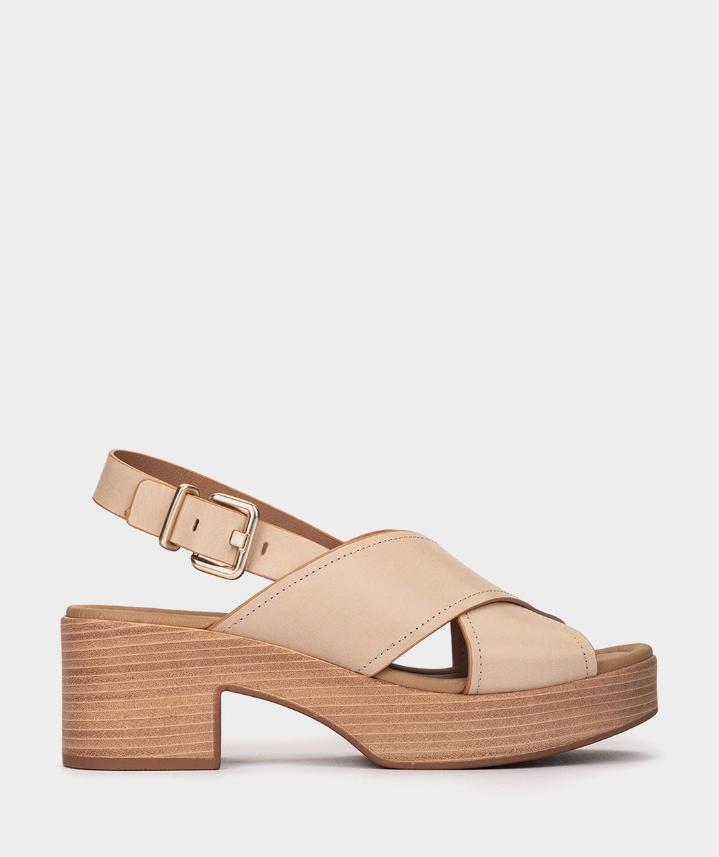 Beige leather sandals with a wood-effect heel. The style's lightness, in addition to its versatile design, is the key to its success. The crossover upper offers greater support.