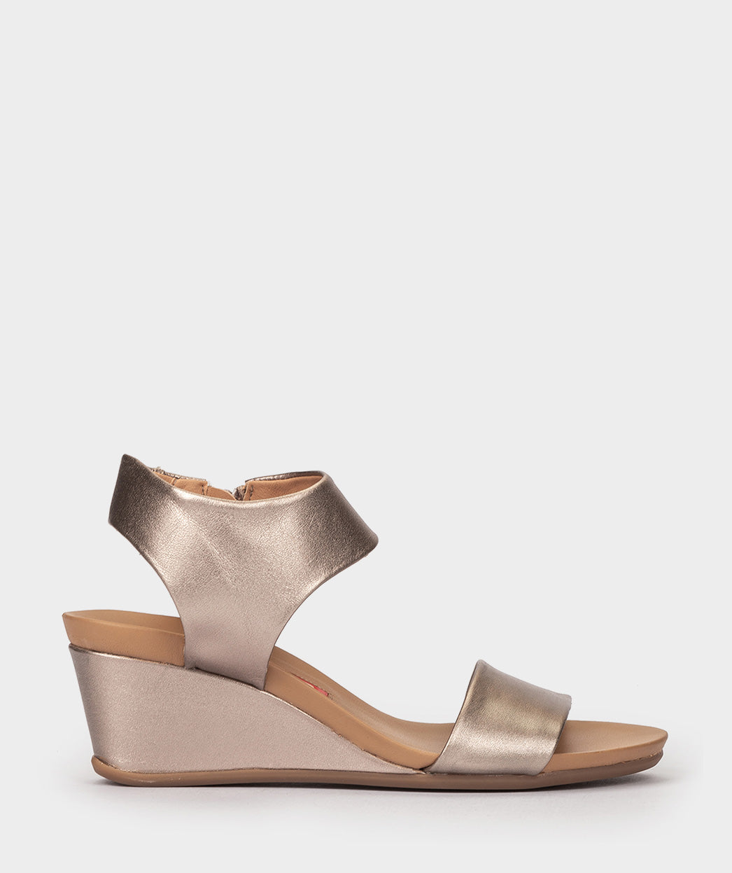 Platinum metallic leather wedges. These wedges are the perfect definition of simplicity and comfort. Combine the MANCILES model in your daily life. It has a side zipper for proper foot support.