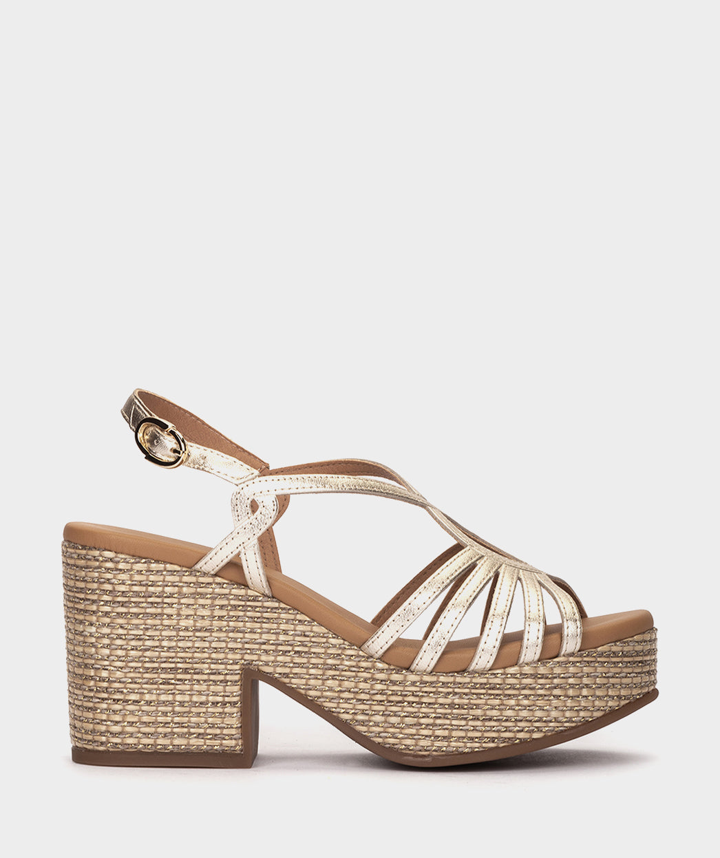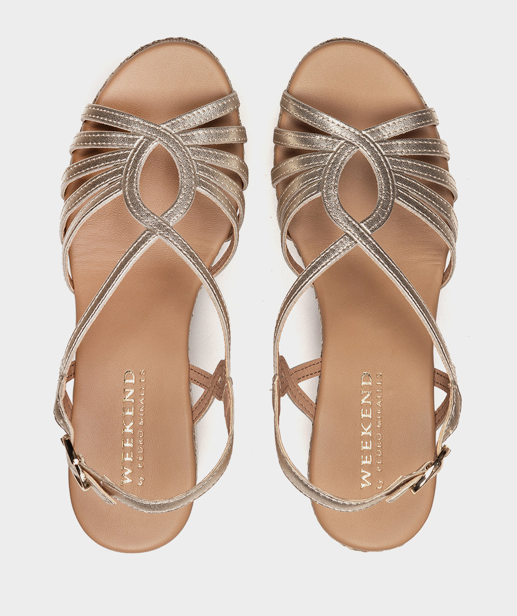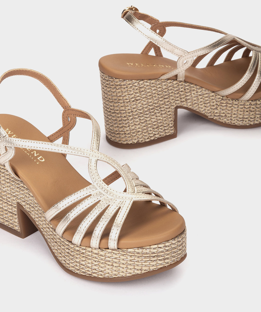 Platinum metallic leather sandals with a raffia platform. A model that is as daring as it is original. Designed to be worn comfortably on dates and special events. The platform has a shiny effect that increases its sophistication.