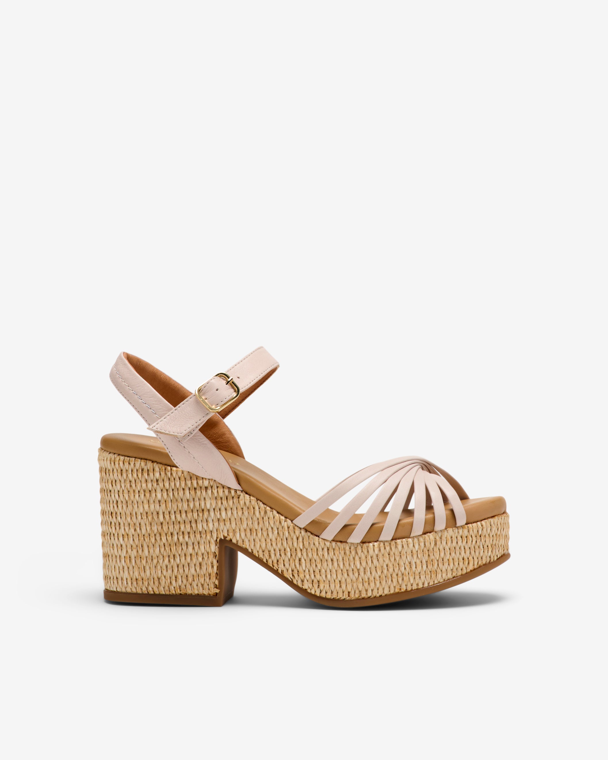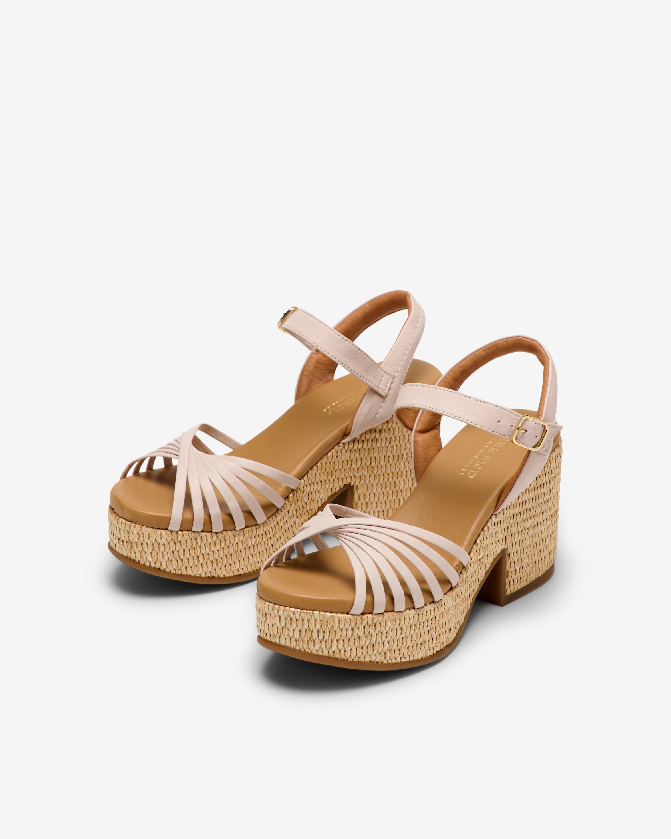 Raffia wedges with pink leather straps. A summery design that combines raffia with crossed leather straps to give it elegance. It has an adjustable bracelet with a metal buckle and padded insole for greater comfort. Model from the Weekend collection by Pedro Miralles.
