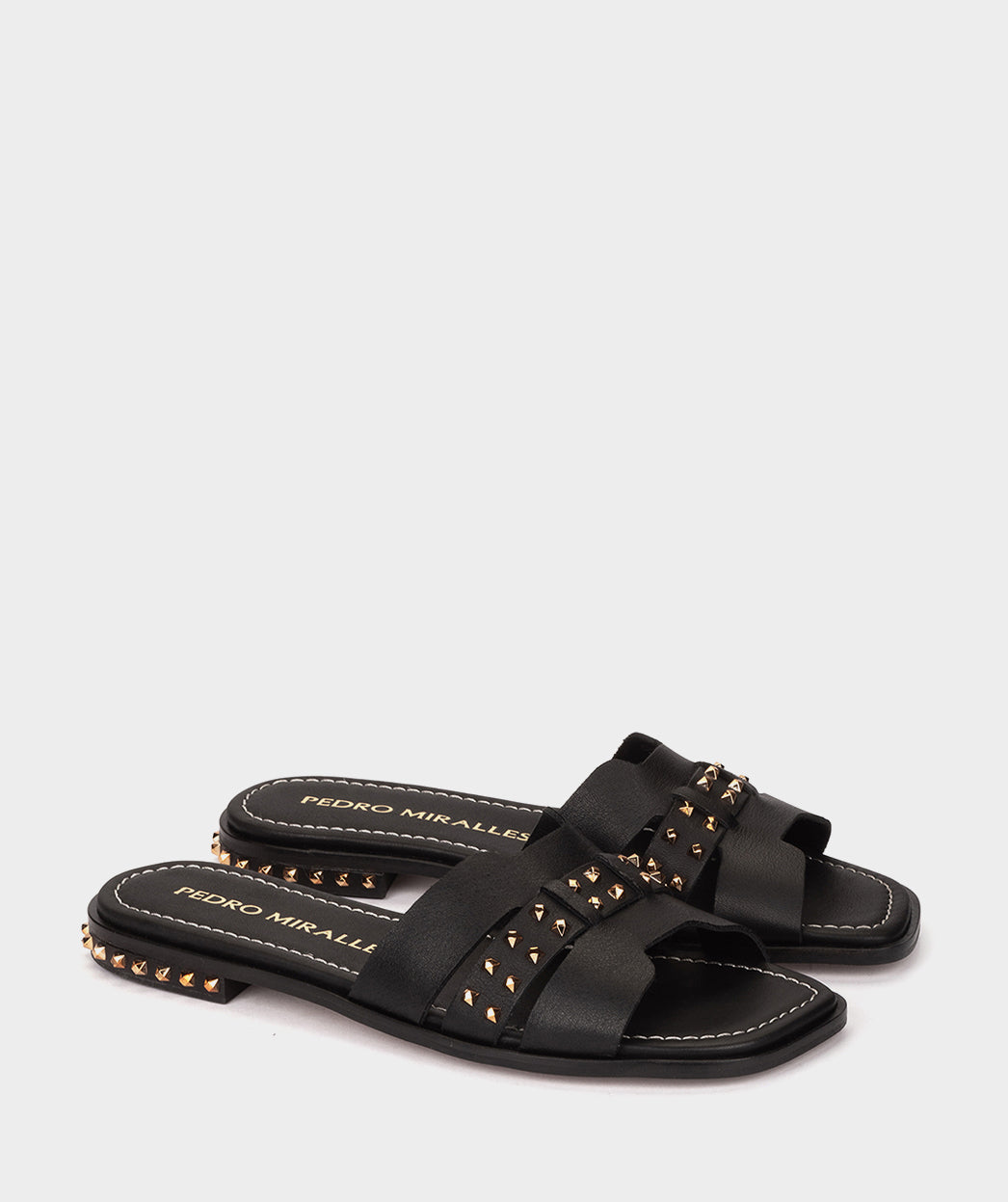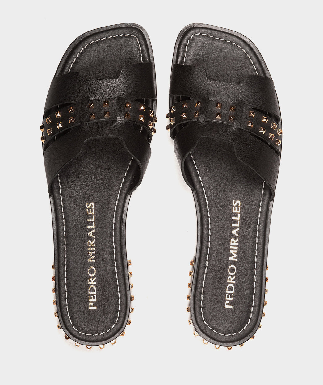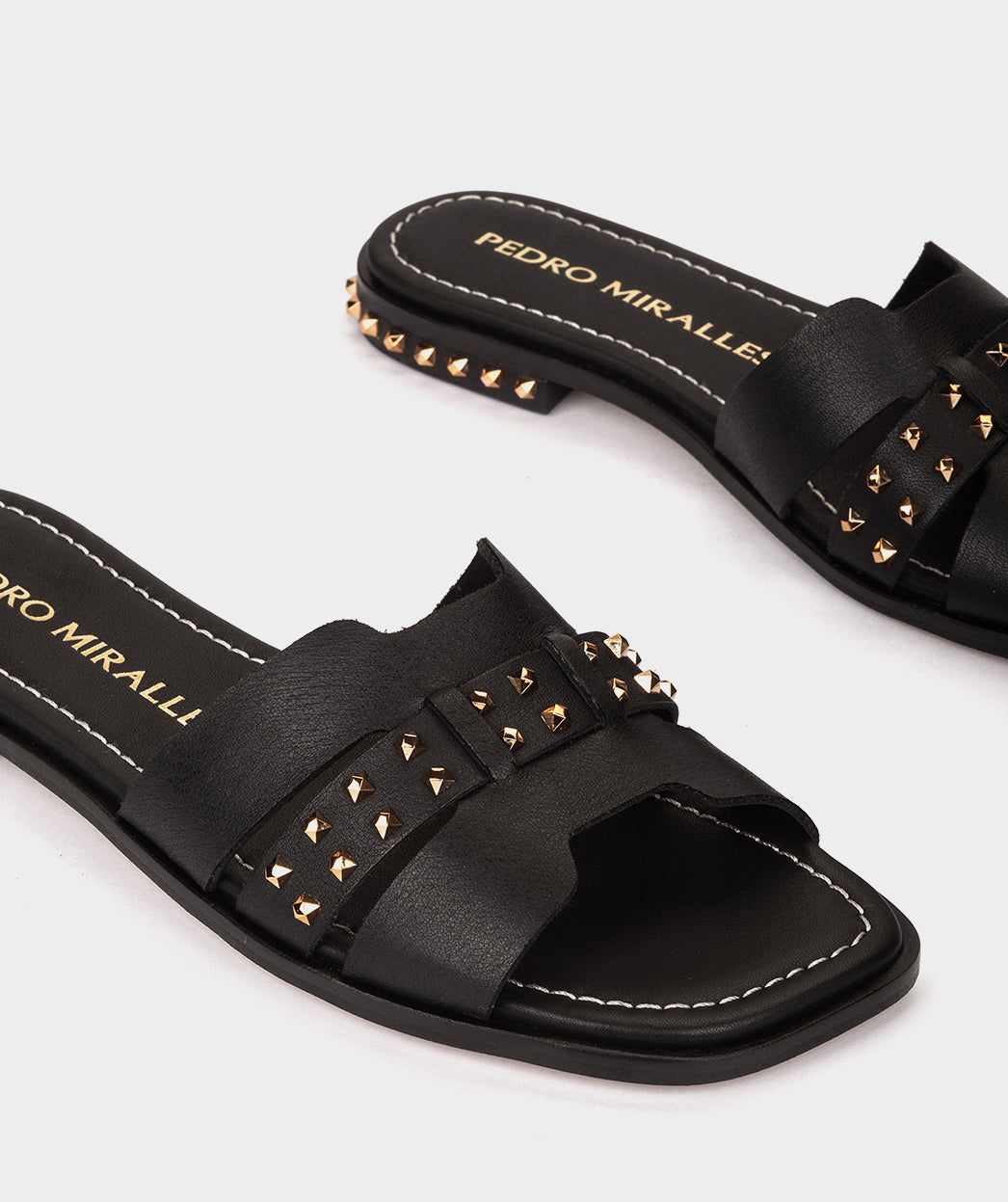 Flat black leather sandals. They'll be the perfect shoe for any occasion. They'll also be ideal for elevating any summer outfit.