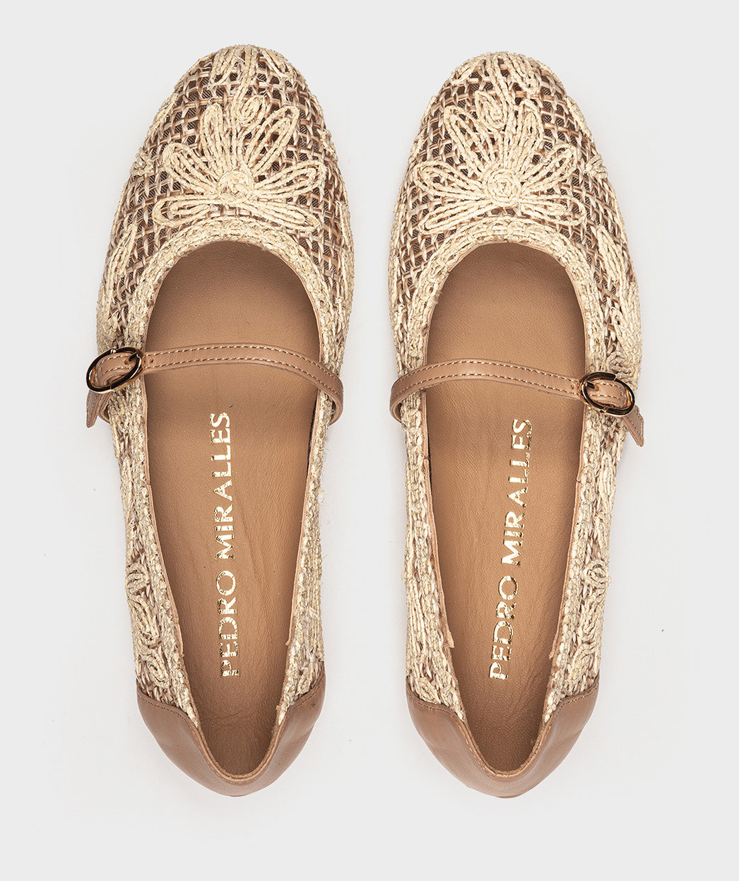 Raffia ballet flats with beige floral motifs. A style that combines fashion and comfort. The design is both flattering and summery, thanks to its details, such as the ribbon on the instep and the leather heel.