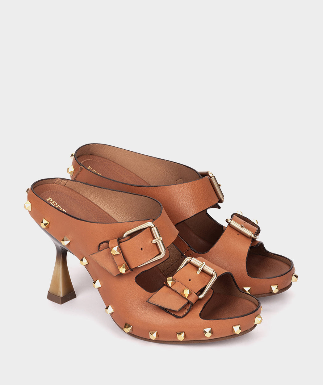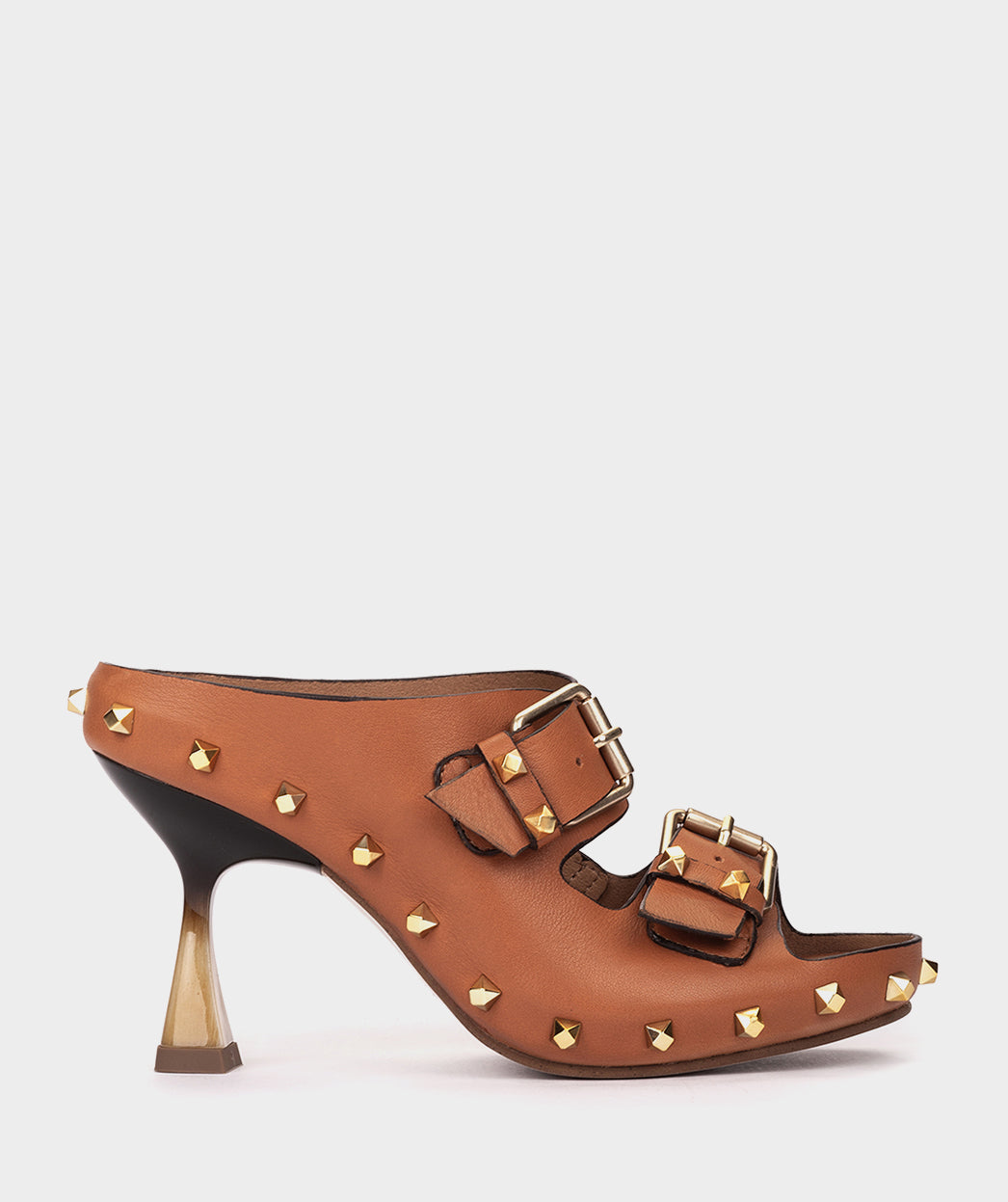 Brown leather open-toe heeled sandals. A modern and bold design, designed for those looking to elevate their looks with an original touch. The combination of the gradient heel with the studs and buckled upper adds personality to this style.