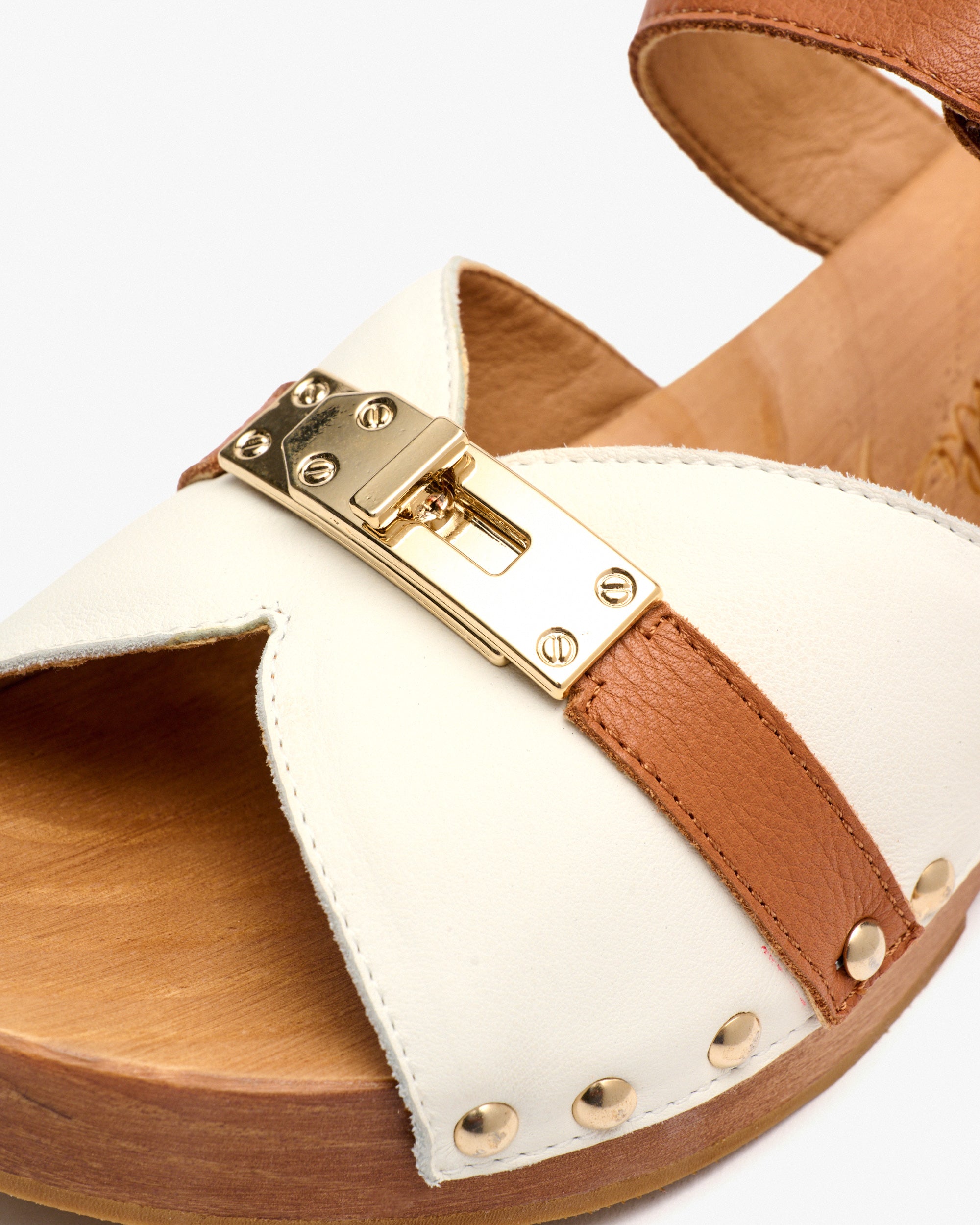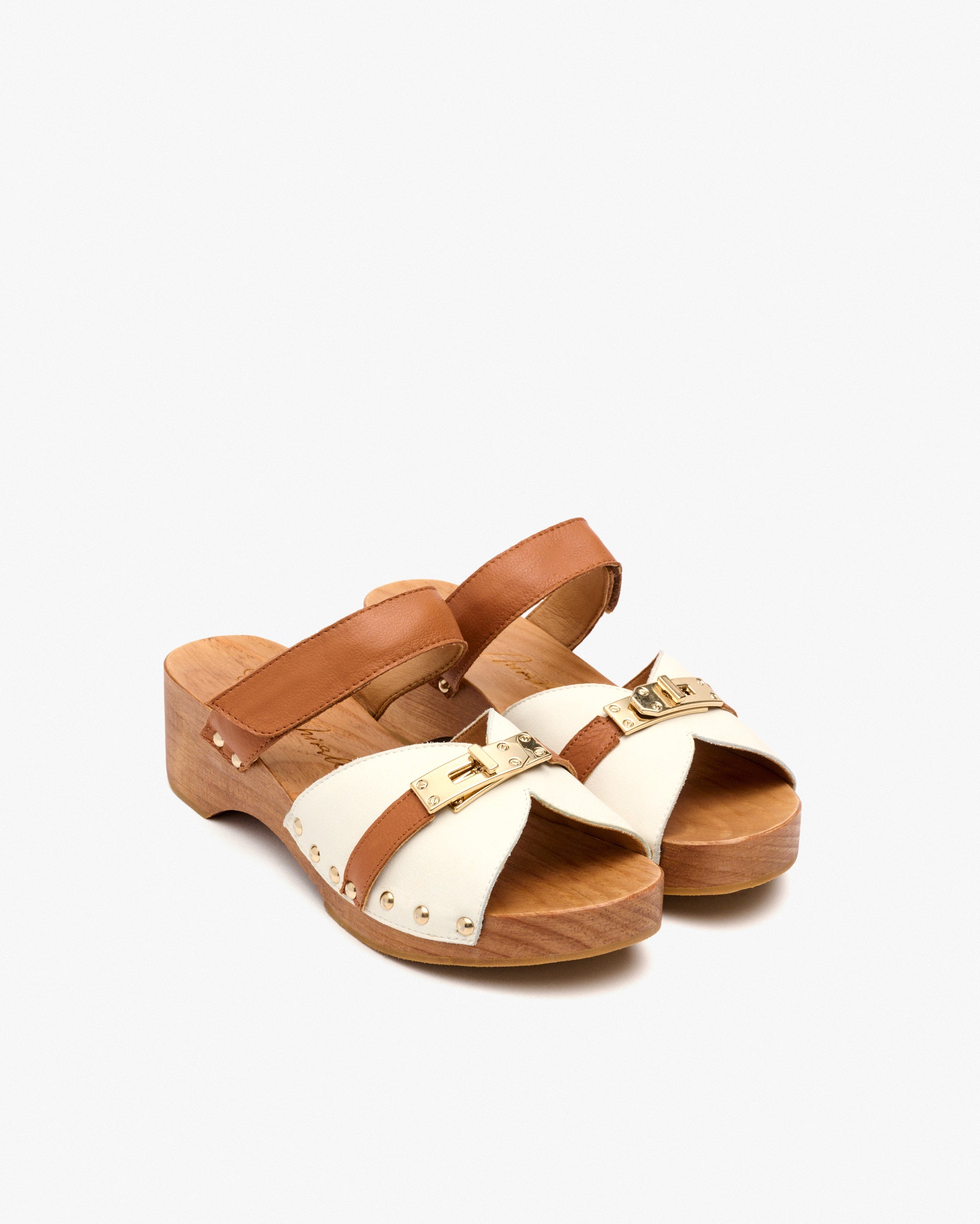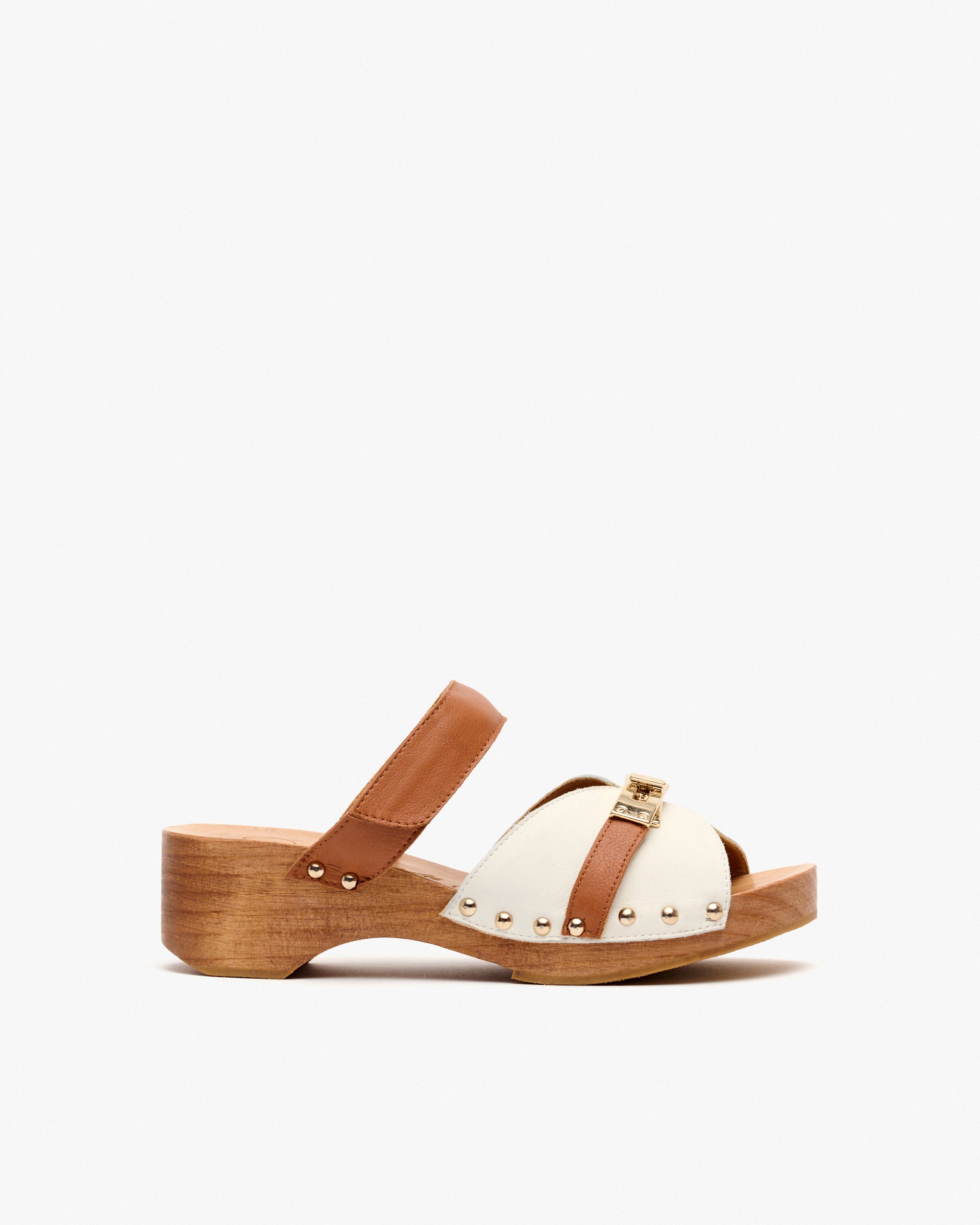 Two-tone leather wooden heel sandals. A 90s-style design that combines stud detailing with a buckle on the instep. It features a Velcro strap for a perfect fit.