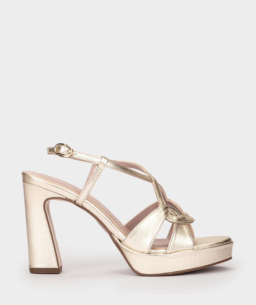 Platinum-colored metallic leather heeled sandals. A design that combines sophistication and comfort. Its silhouette offers optimal support, perfect for wearing to your events without worries.