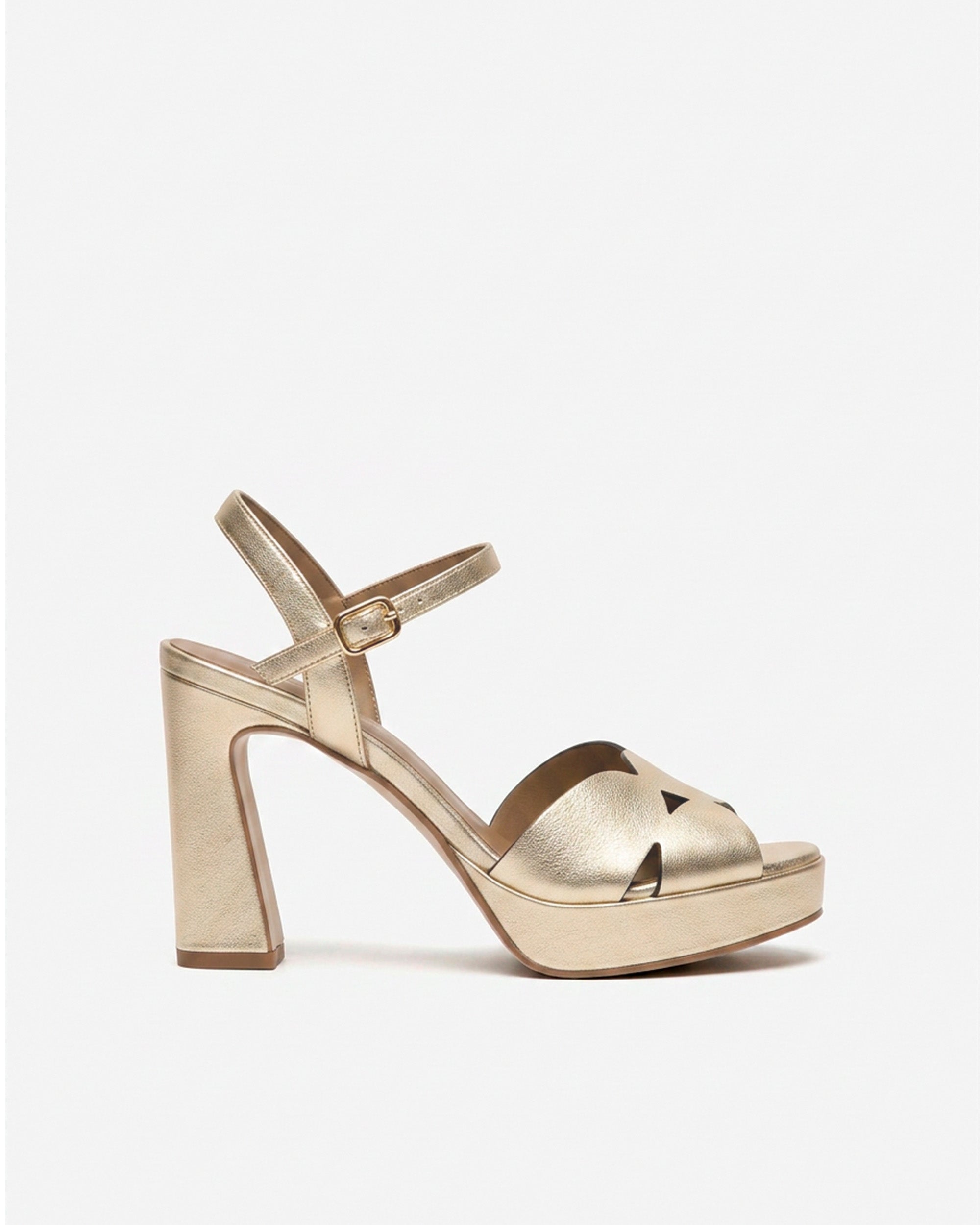 Metallic leather platform heeled sandals. A new version of the BALI model. Enhance the silhouette of the foot by making the upper with geometric figures. Ankle strap closure and diamond buckle.