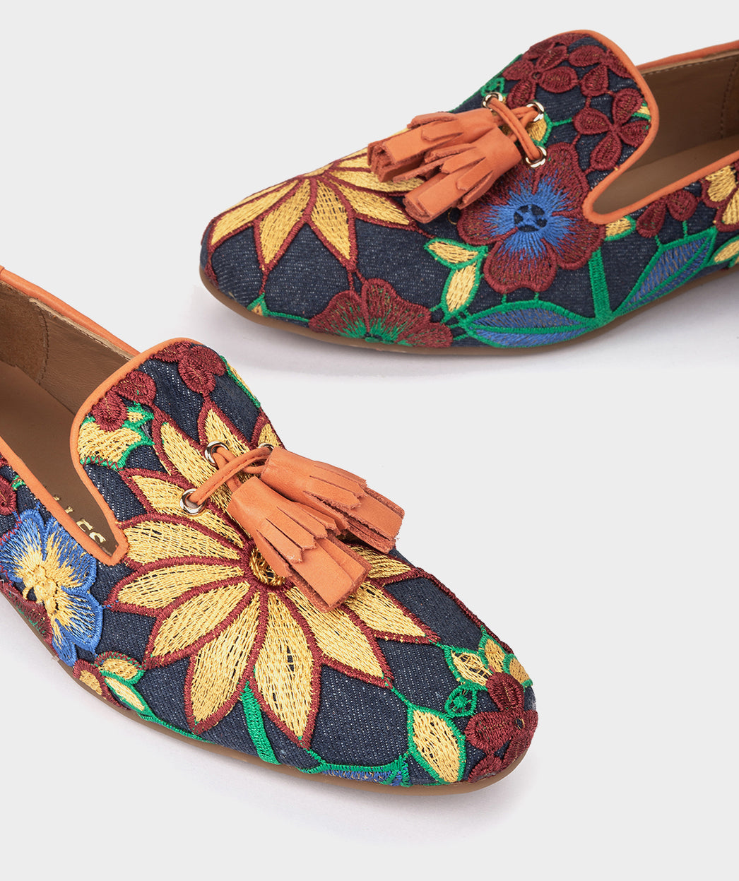 Multicoloured printed fabric loafers. An original model that stands out for its colour. The most fun and daring version of loafers. The ideal option to add colour to your looks this season.