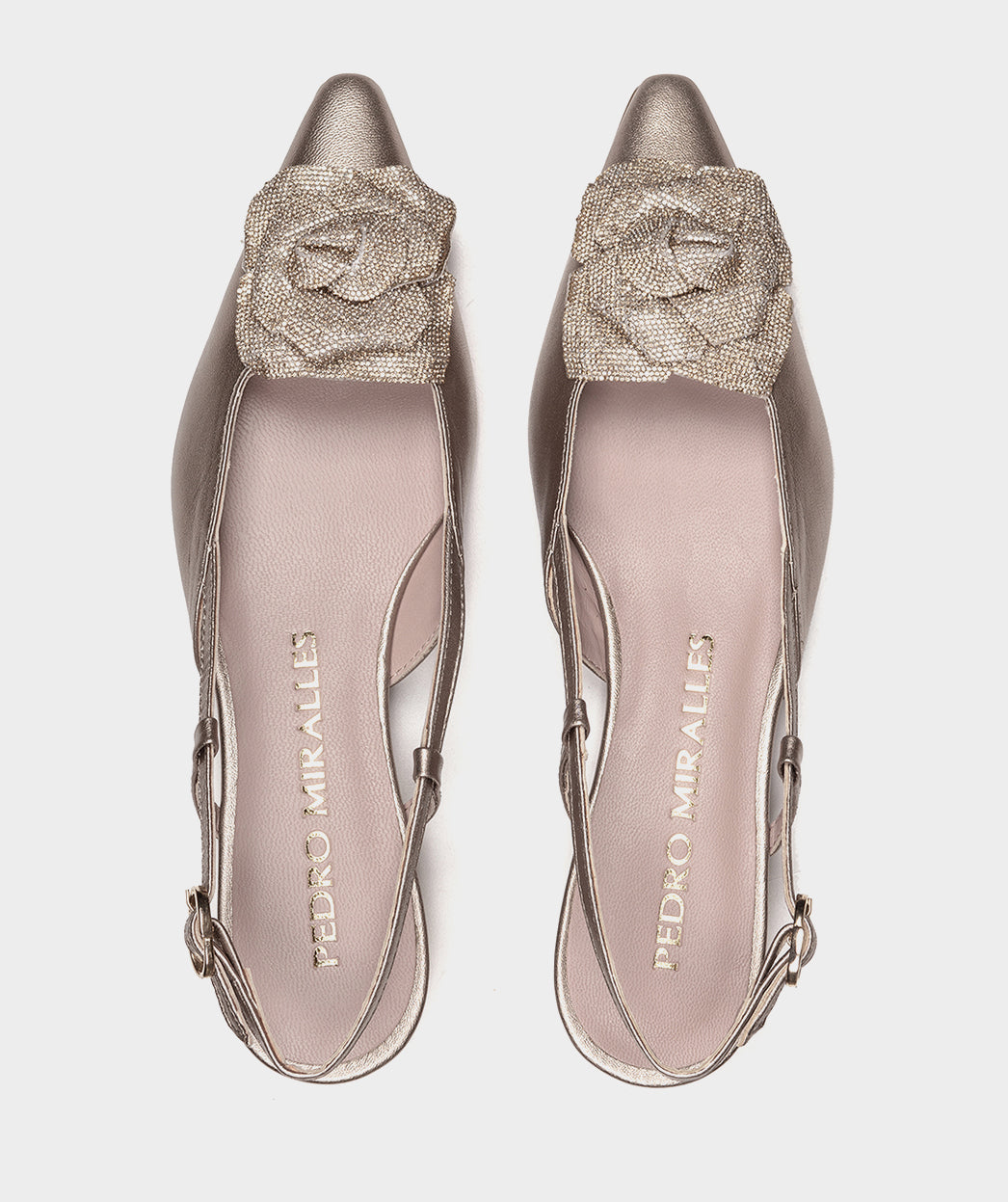 Smoke-coloured metallic leather slingback shoes. This elegant design combines with the floral decoration, adding a touch of sophistication to any look. Designed to provide maximum comfort and style at the same time.
