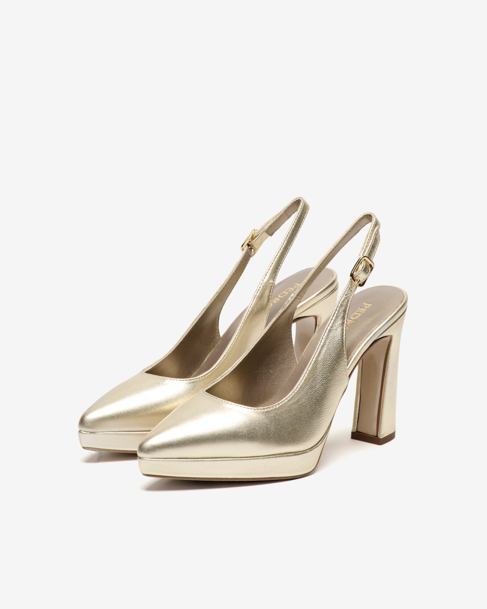 Platinum metallic leather slingback heels. A new version with a chunky heel. The Rena model is a reinterpretation of our iconic living rooms that will provide you with an elegant height without sacrificing comfort.