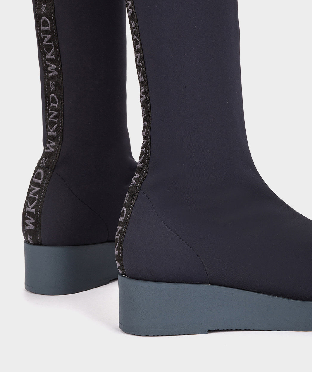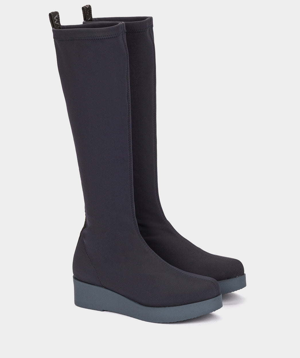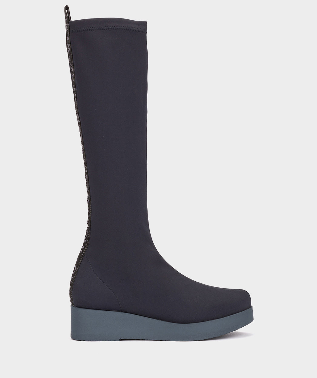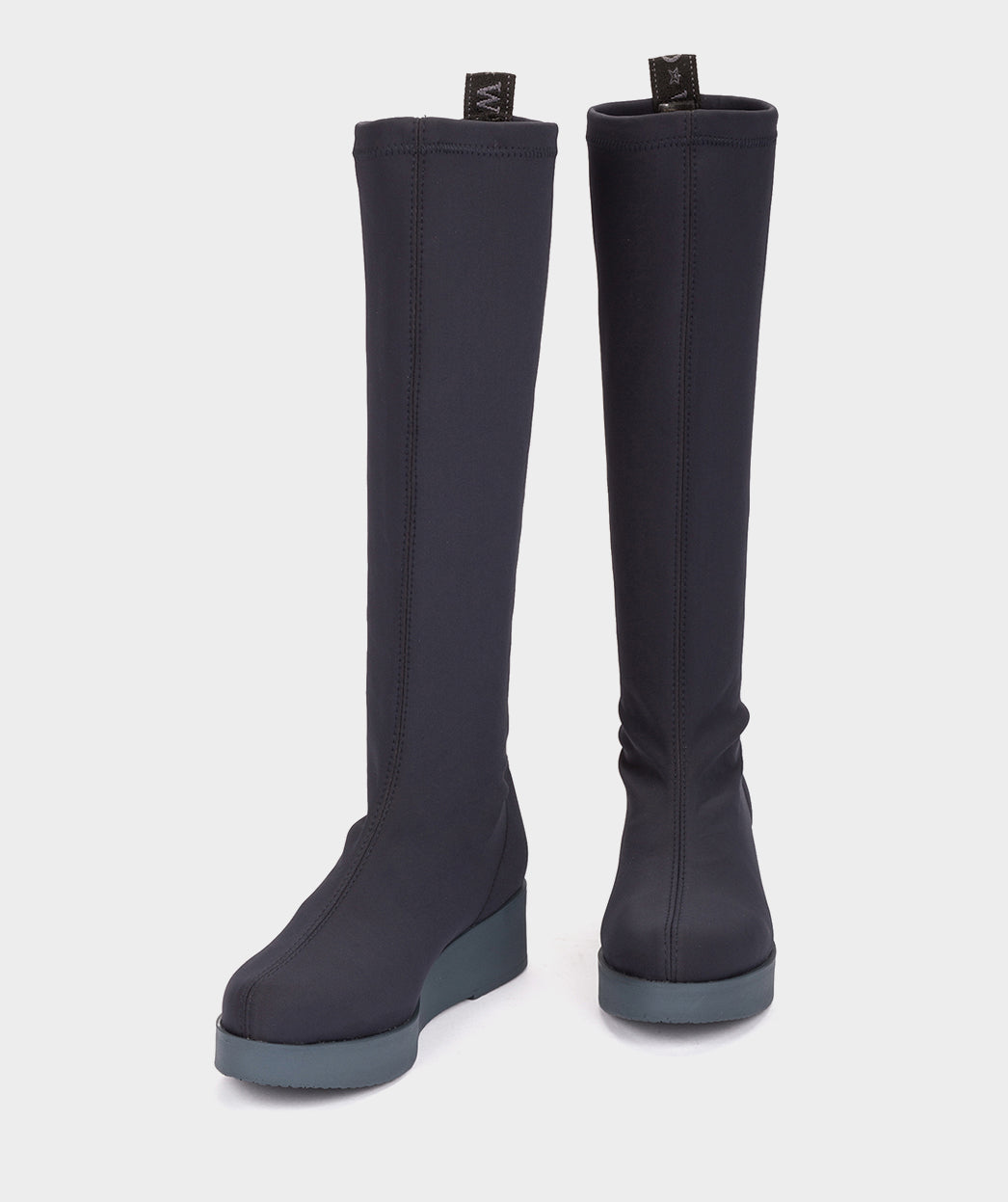 High boots in navy blue stretch fabric. The COMBE model moulds to your foot like a second skin for an impeccable fit. Try teaming them with skirts and dresses.