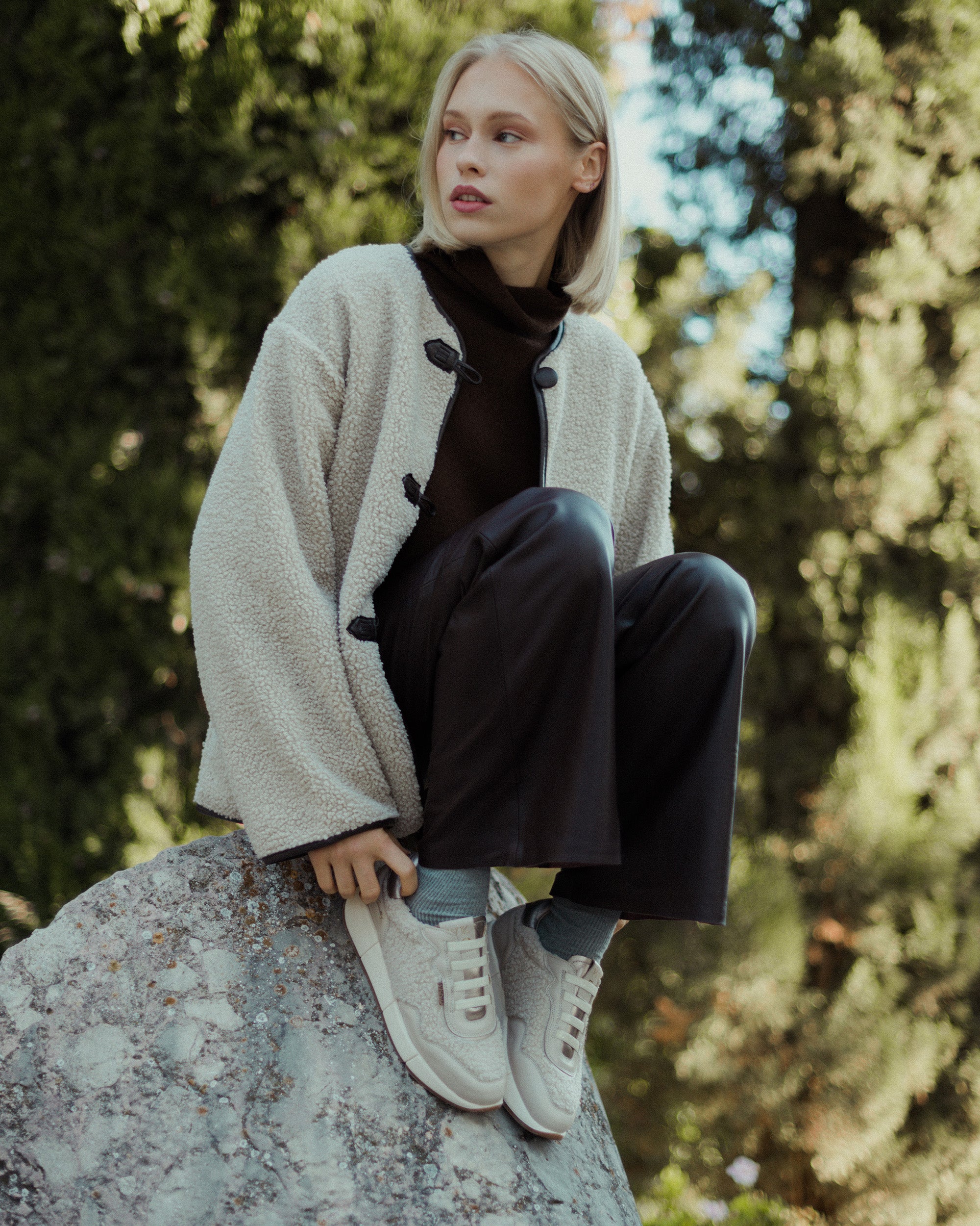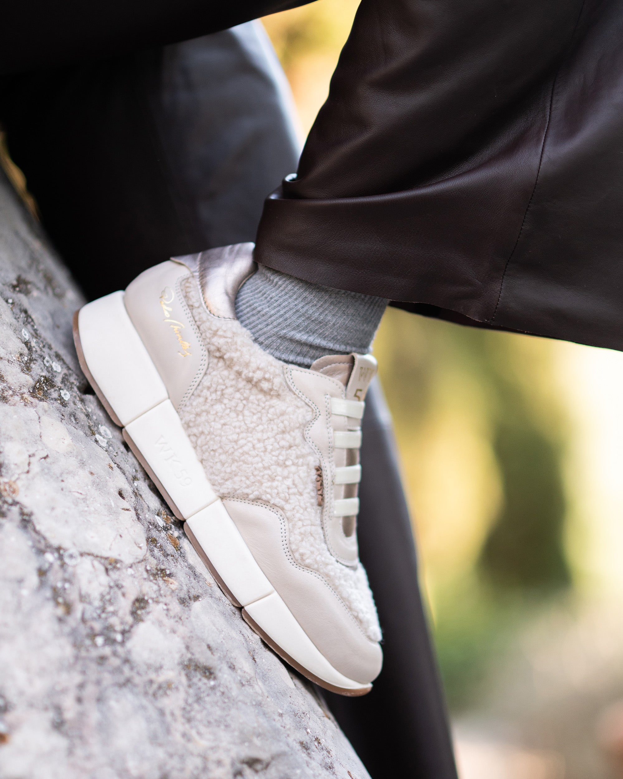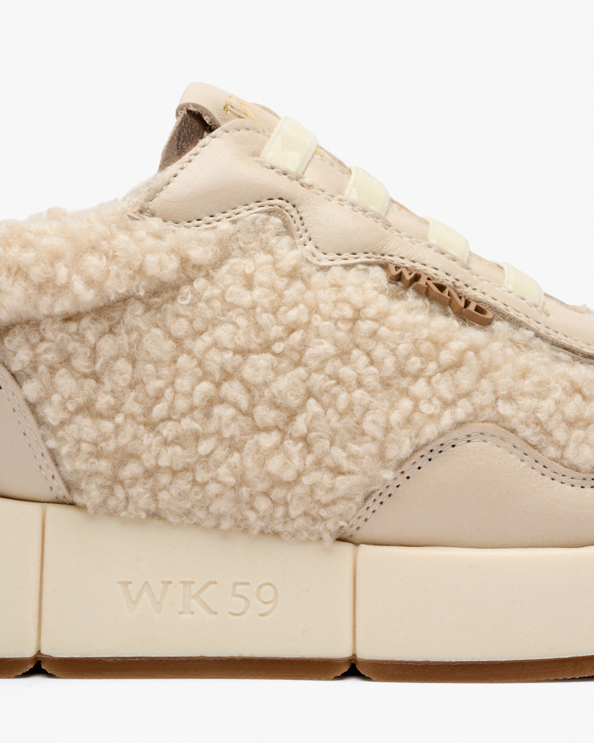 Sports shoes made of sheepskin fabric and beige leather. A design that combines elegance, comfort and originality. Their soft texture and unique hue make them the perfect choice for a modern, casual and distinctive style.