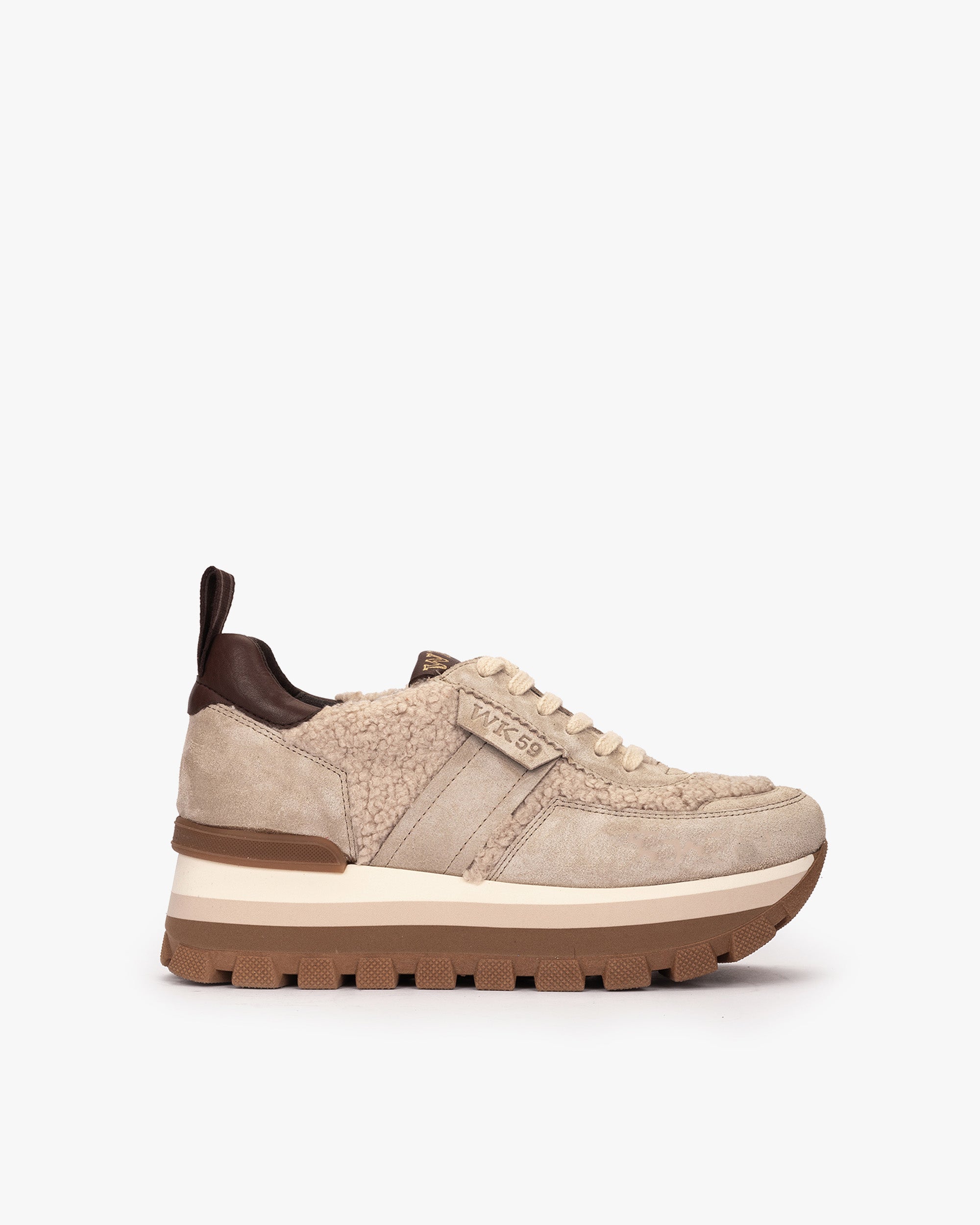 Beige sheepskin effect fabric sports shoes. Designed for the most daring sports shoe lovers, our GORDES model will become your favorite of the winter season. Its design has details such as the combination of fabrics, elastic laces and a tricolor platform; resulting in a model of 10. It has a removable insole.