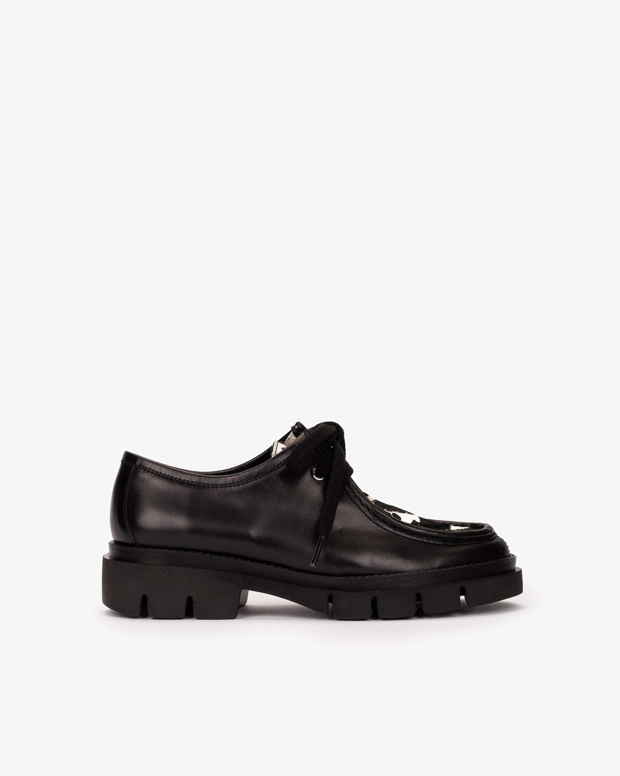 Flat leather shoes with printed detail and laces. A modern and daring design that stands out for the cow print fur detail. The laces allow you to adjust it to your liking and offer optimal grip.
