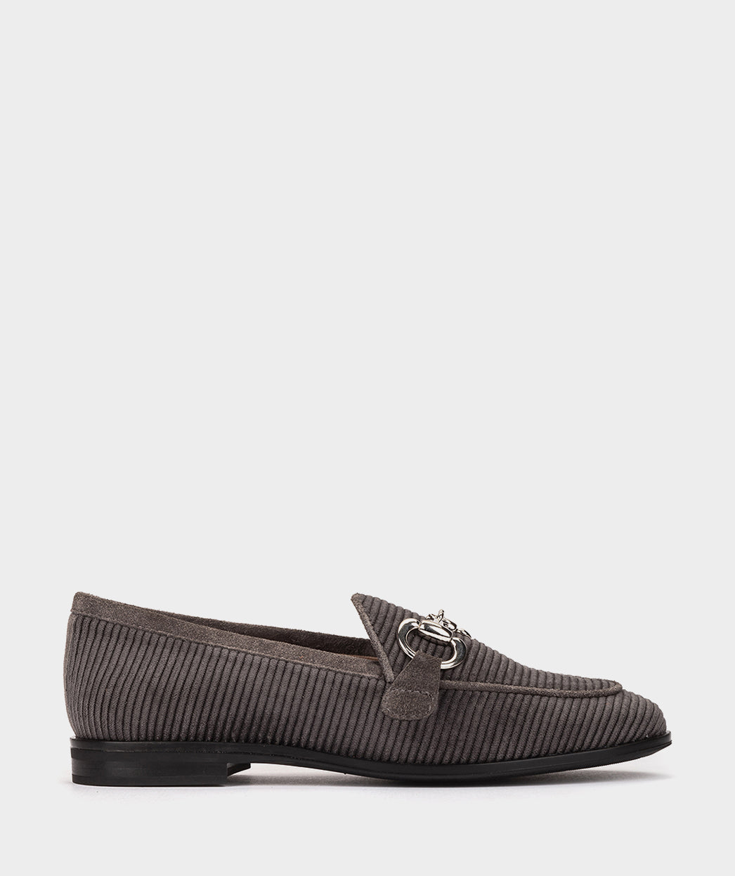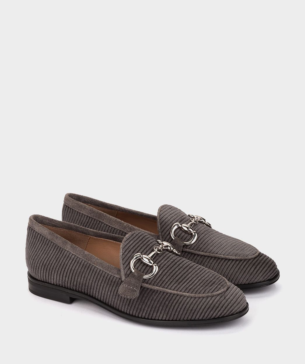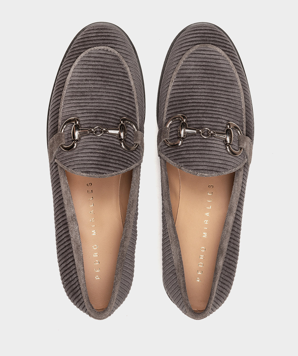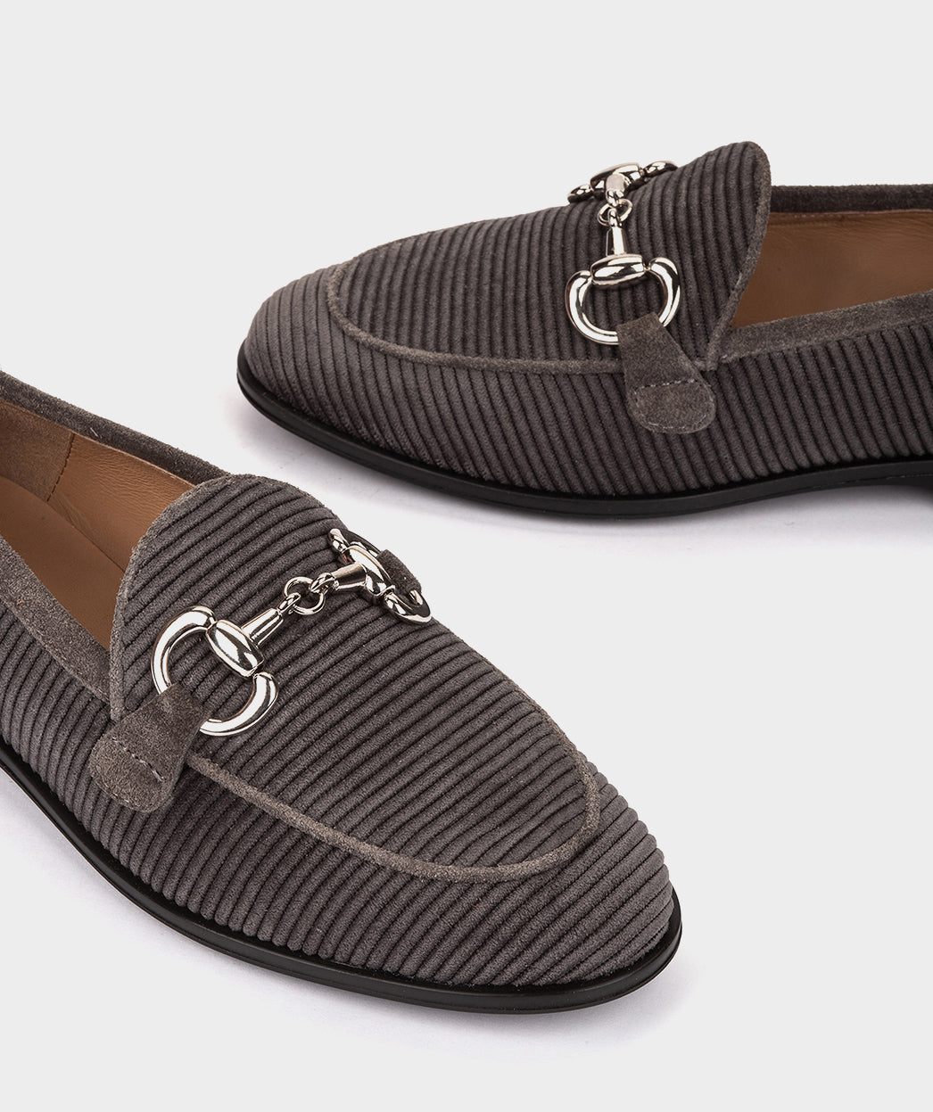 Charcoal gray corduroy loafers with gold trim. These loafers will become your best ally this season, since they are a basic that you cannot miss due to their versatility and comfort.