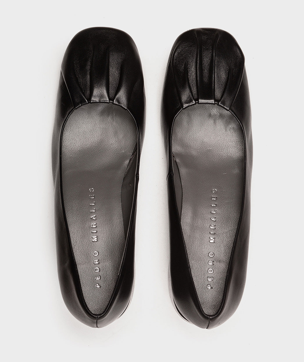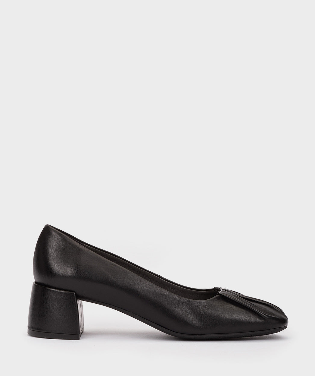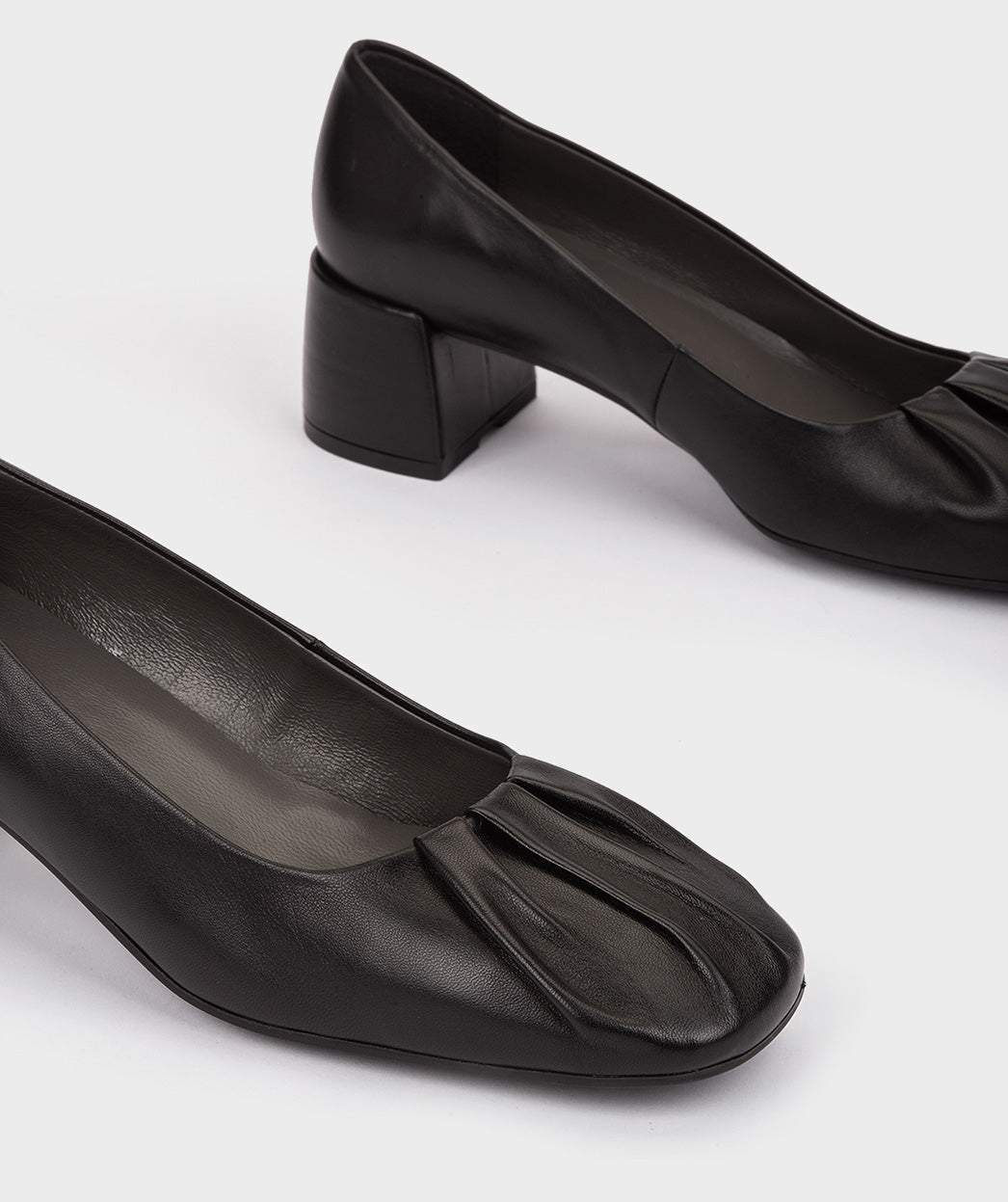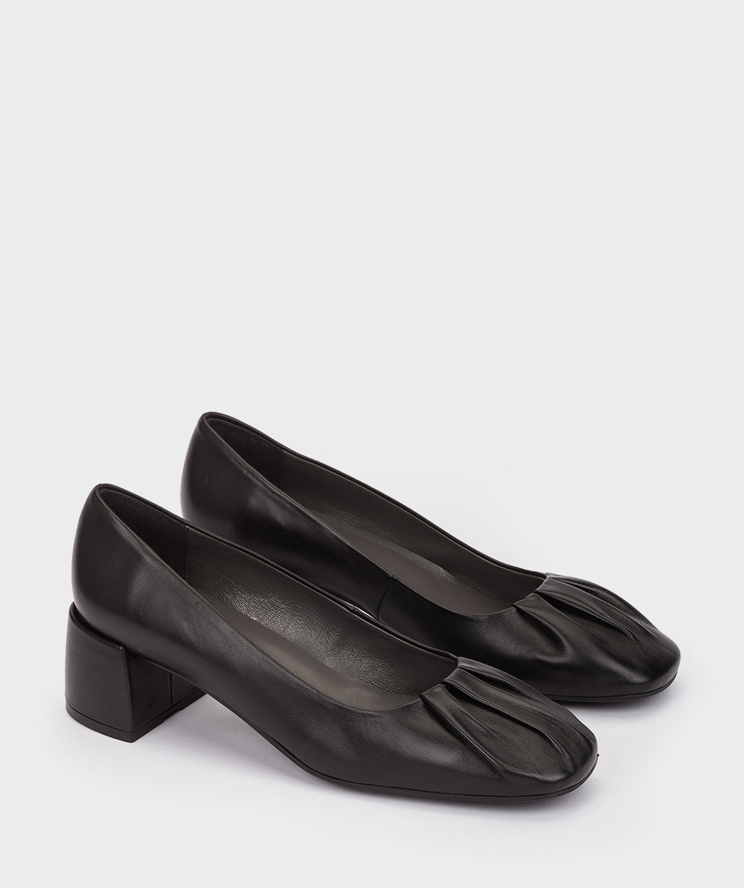 Black leather heels. A model that stands out for its gathered-effect upper. The ideal option to complete office outfits and everyday looks.
