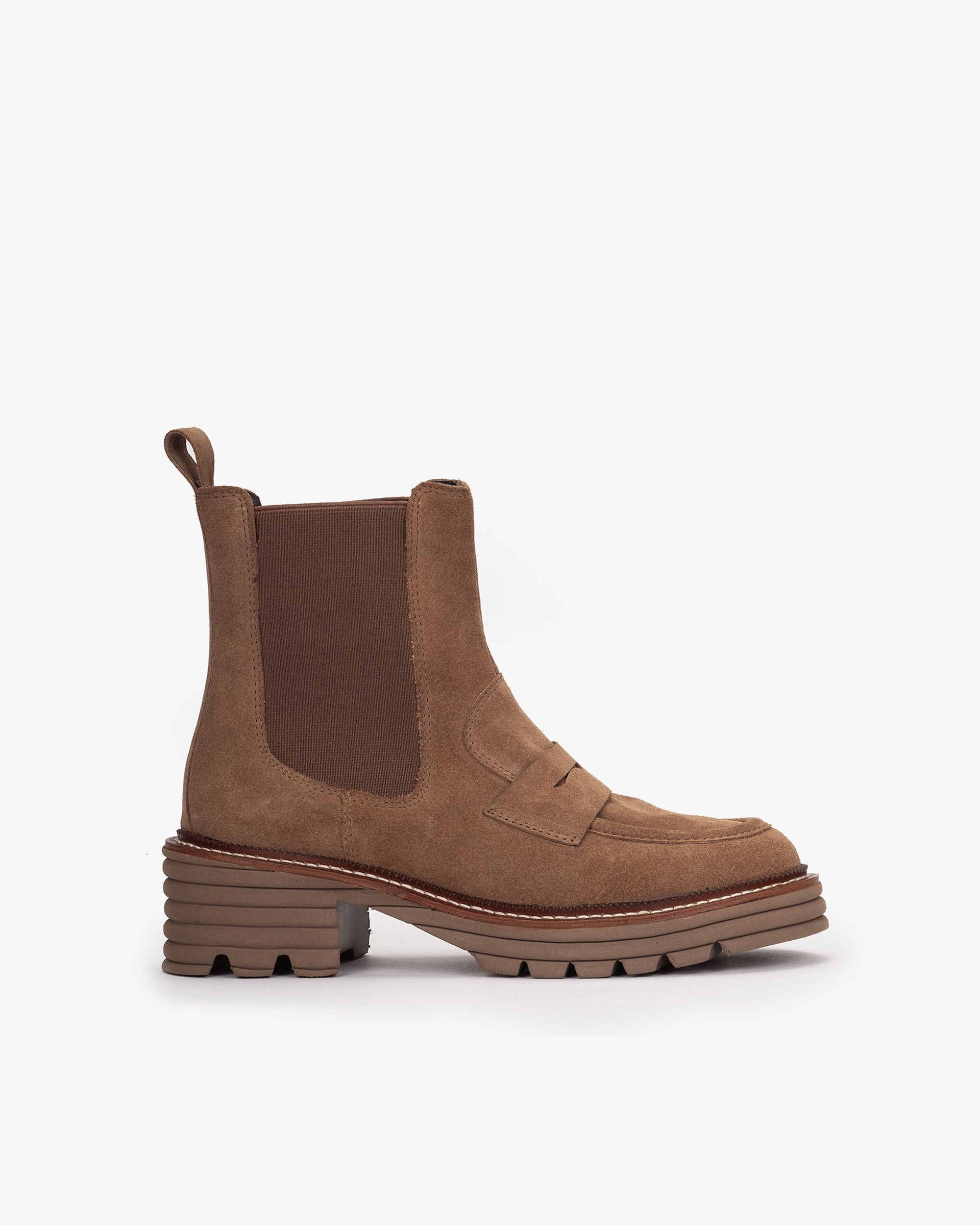 Brown suede ankle boots with elastic. This model, inspired by the moccasin style, stands out for its distinctive sole and the detail of the mask on the instep, combining casual style and elegance.