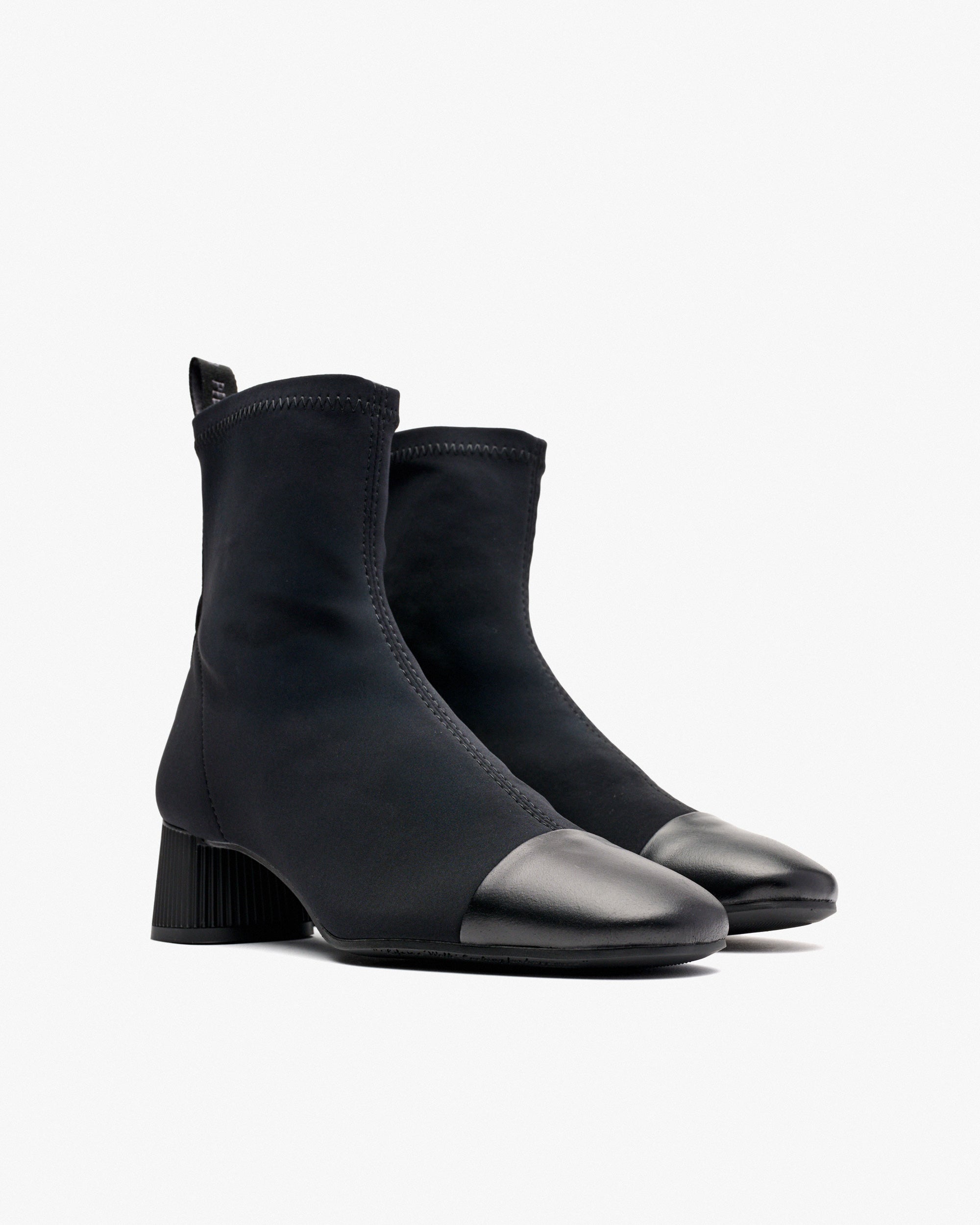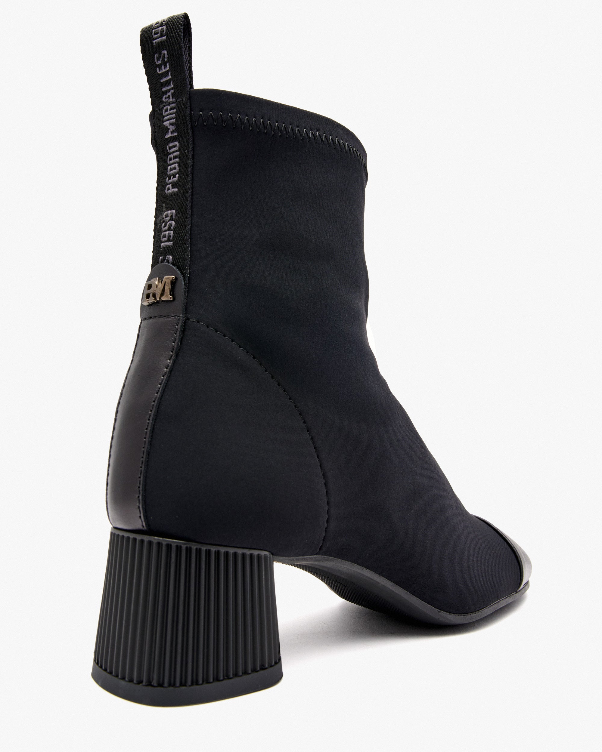 Black stretch fabric ankle boots. This model offers comfort and a perfect fit. Its design combines materials, textures and tones to give it personality. An ideal option to wear daily combining style and practicality. Its stretch fabric allows it to be comfortably put on.