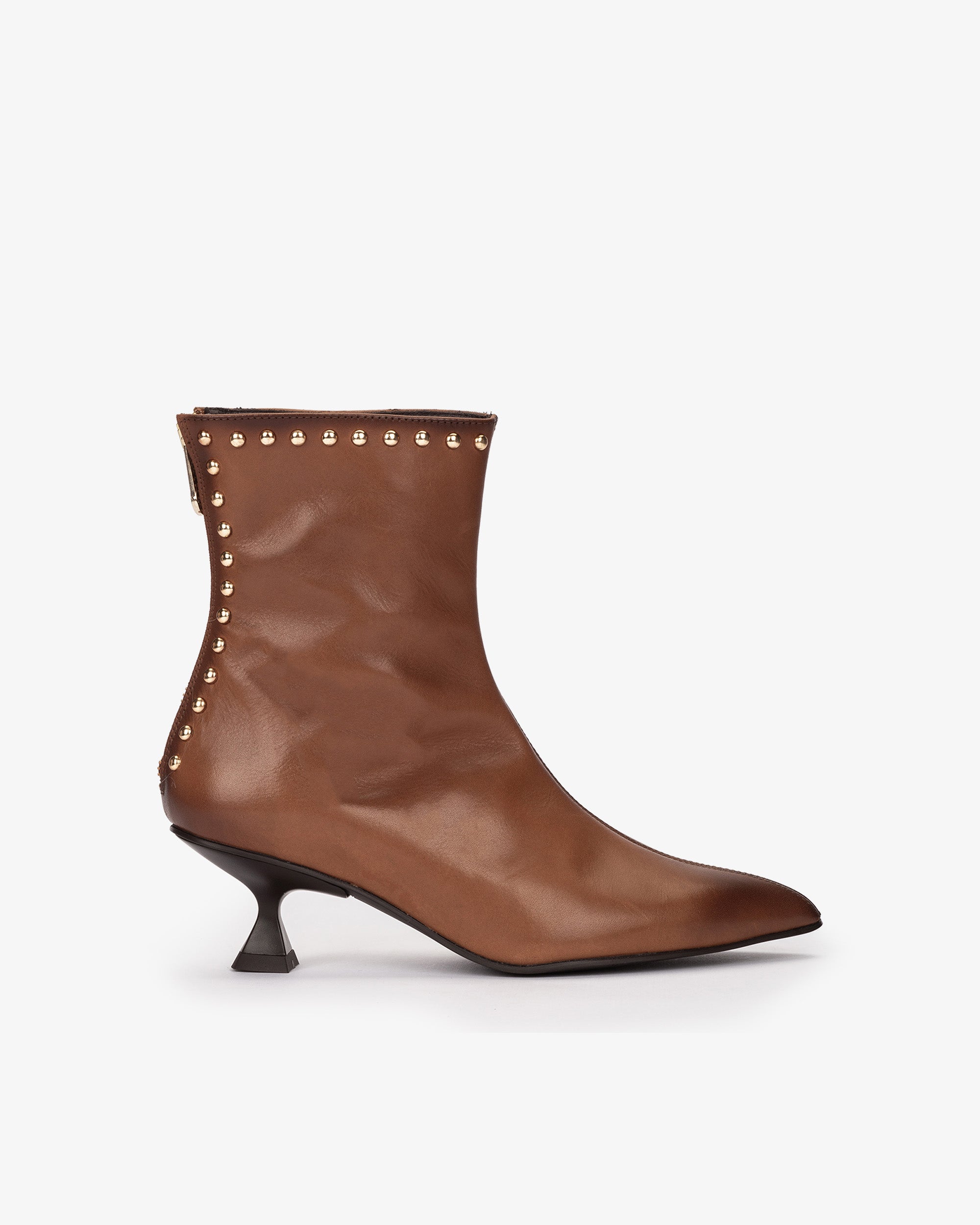 Brown leather ankle boots with studs. This model stands out for the detail of the studs that wrap around the cuff of the ankle boot creating a daring and rocker look. The back zipper is as practical as it is aesthetic. A design with which to give a touch of originality to your looks of the season.