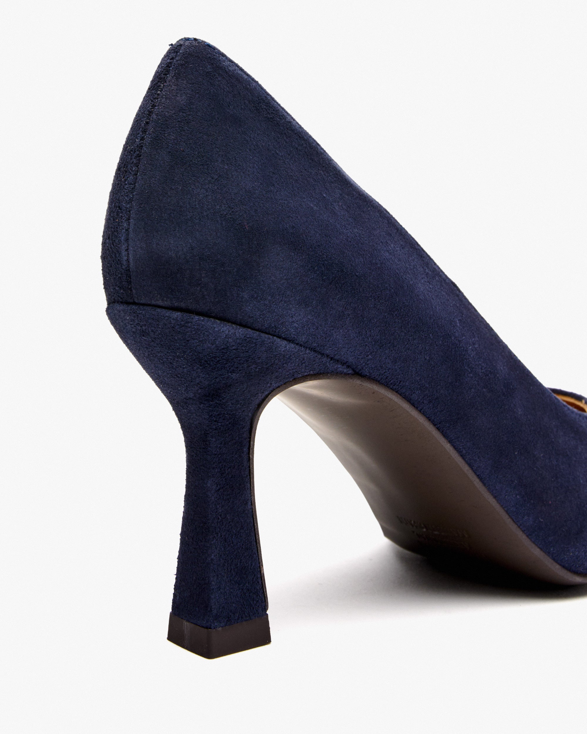Navy blue suede heels. The MONTREAL model is the classic court shoe, this time perfected with a profile of pure waves. This design becomes one of the most elegant, feminine and special models of the season.