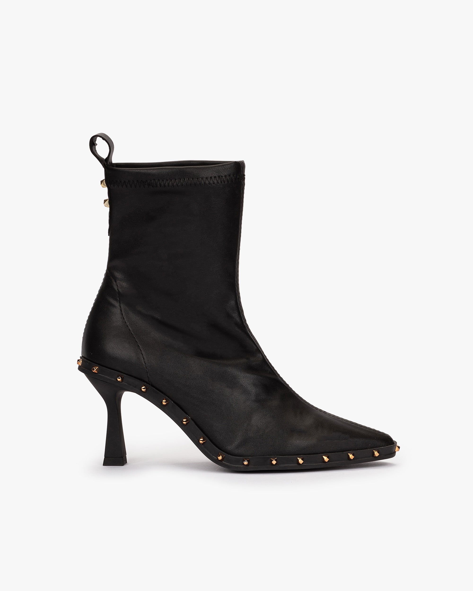 Black stretch fabric ankle boots. TORONTO ankle boots are a classic must-have in any wardrobe. A design that combines style and versatility, providing an elegant and timeless option for various occasions. Its stretch fabric offers an optimal fit and greater comfort of movement when walking. The detail of the studs makes the difference of the model.