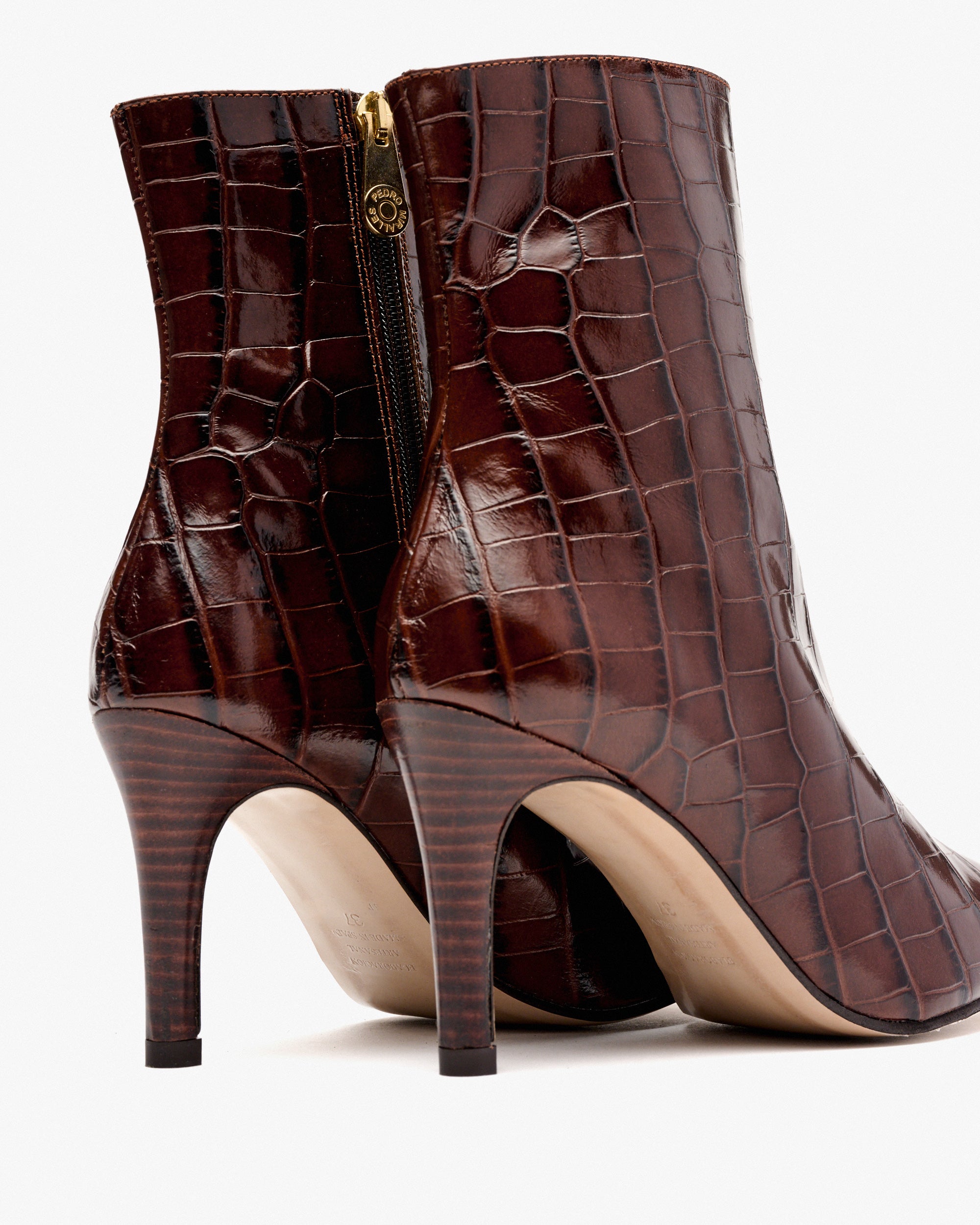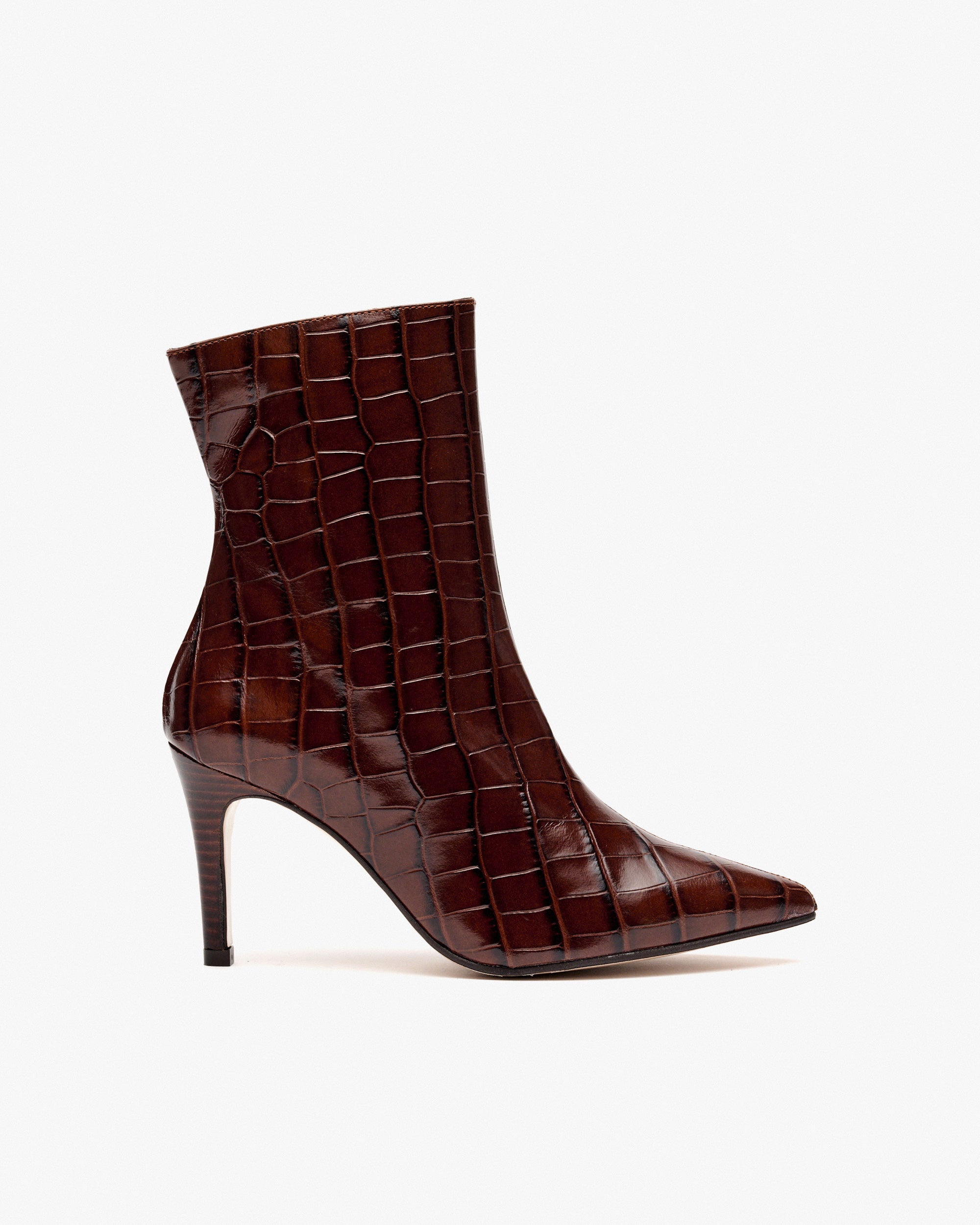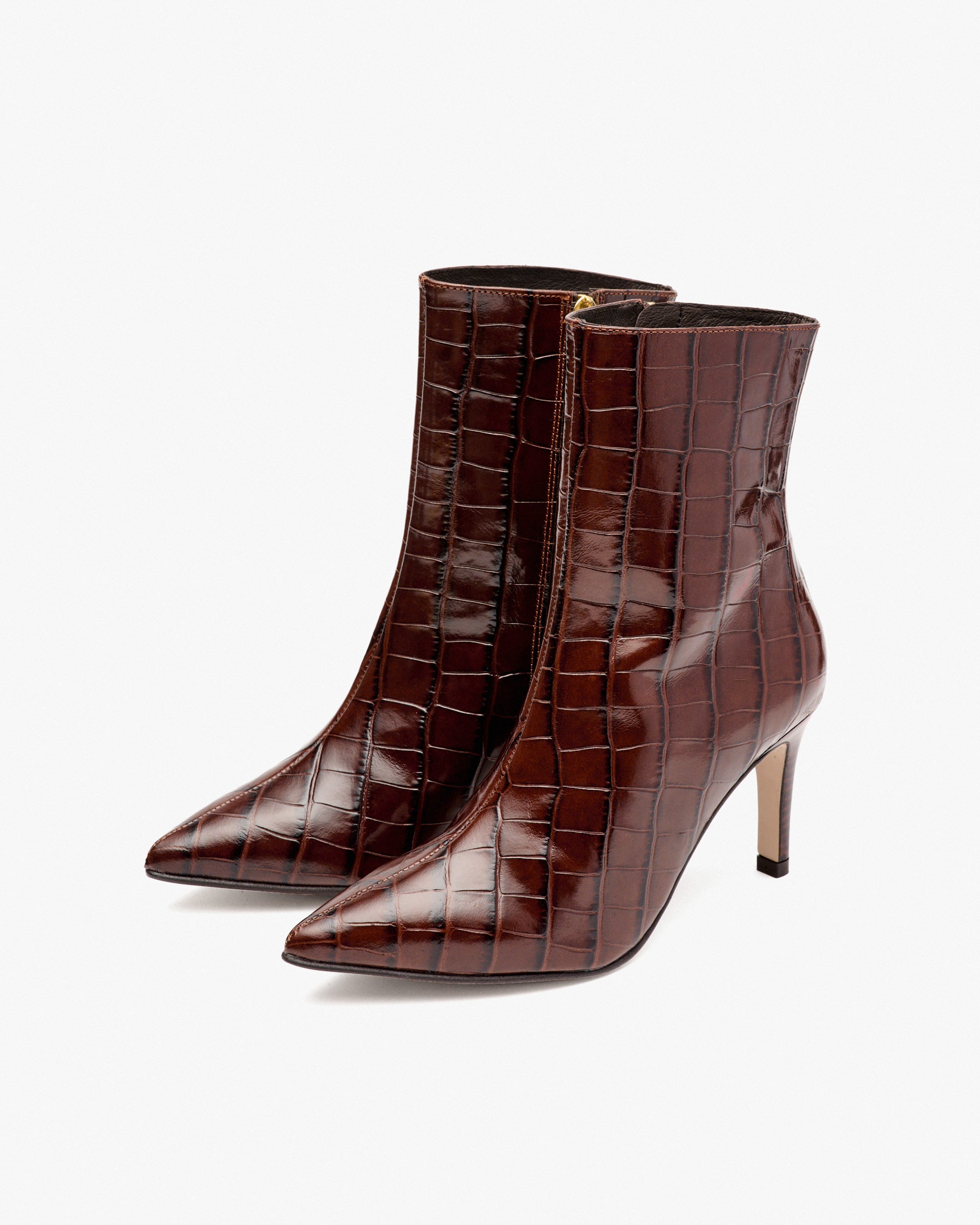 Brown engraved leather ankle boots. A perfect choice for an elegant and refined look. Comfortable and elegant, they bring a touch of sophistication to your wardrobe. The pointed toe and stiletto heel stylize the silhouette.