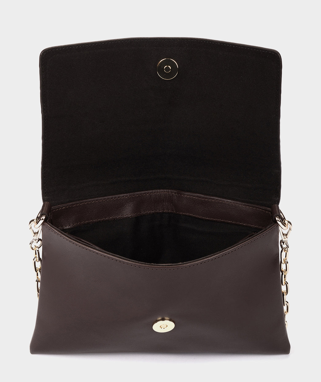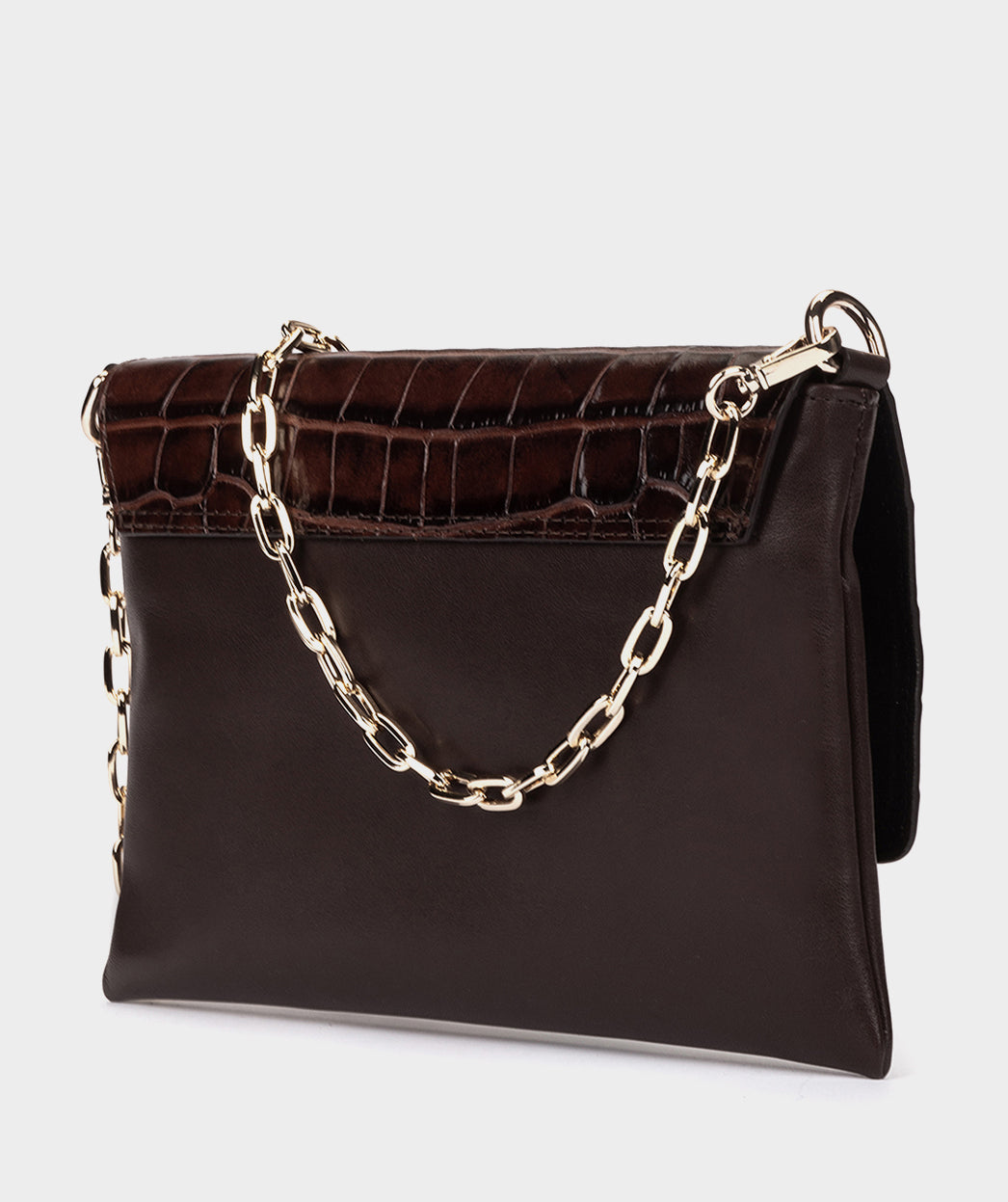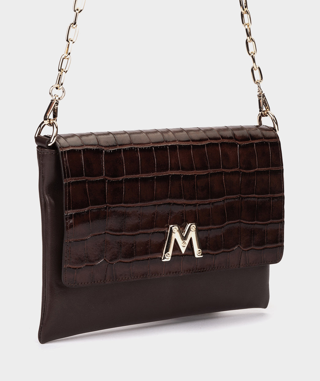 Brown embossed leather crossbody bag with chain. A more sophisticated version of the MINAYA model elevates the style's versatility, perfect for wearing on special occasions as well as in your everyday life. It features a magnetic closure.