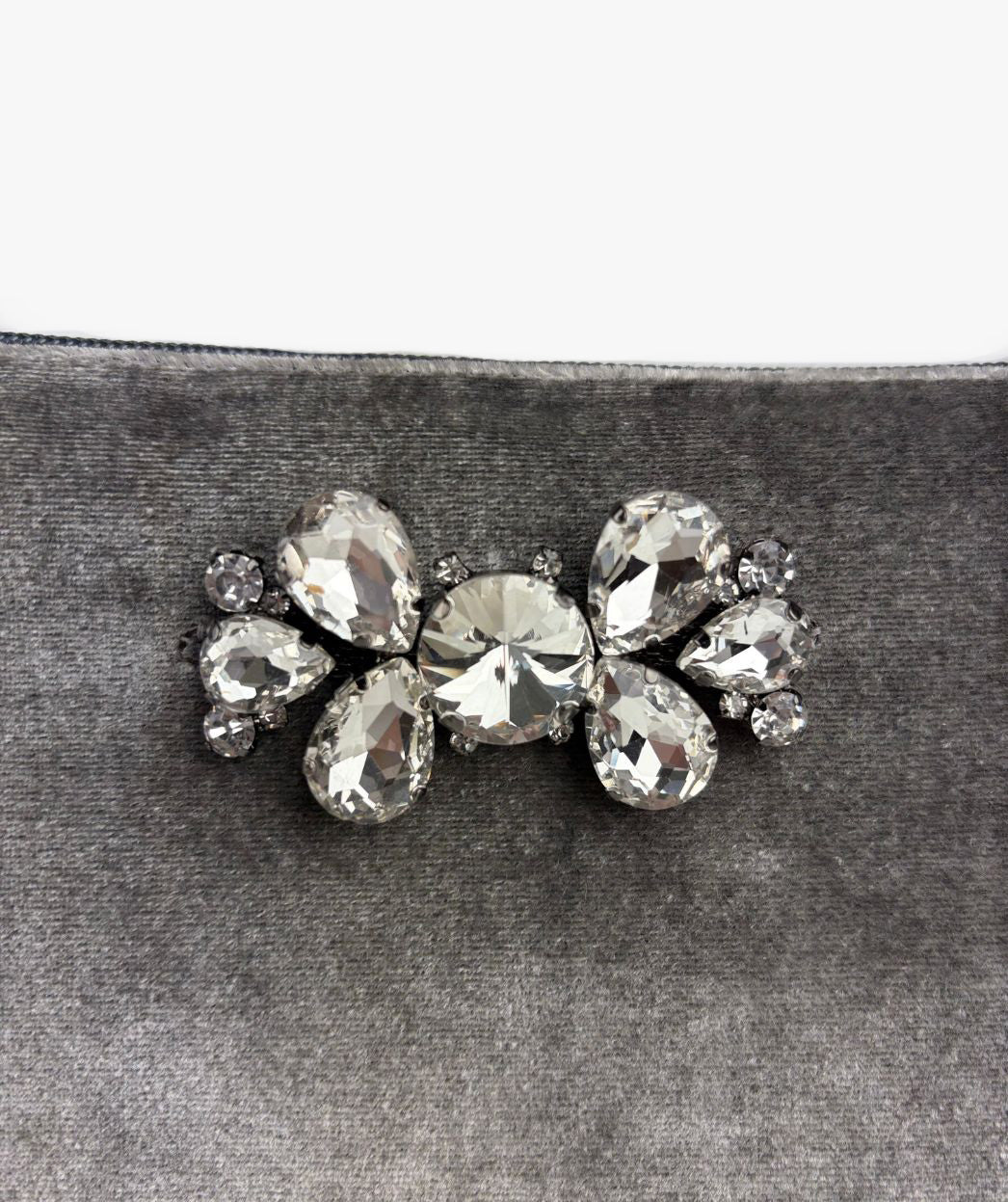 Gray velvet handbag. A festive version full of sparkle to complete your looks for events. Our COVADONGA bag will become your best accessory this season. Its compact and practical design makes it a special piece with which you will want to combine all your looks. Zip closure. It has no handle.